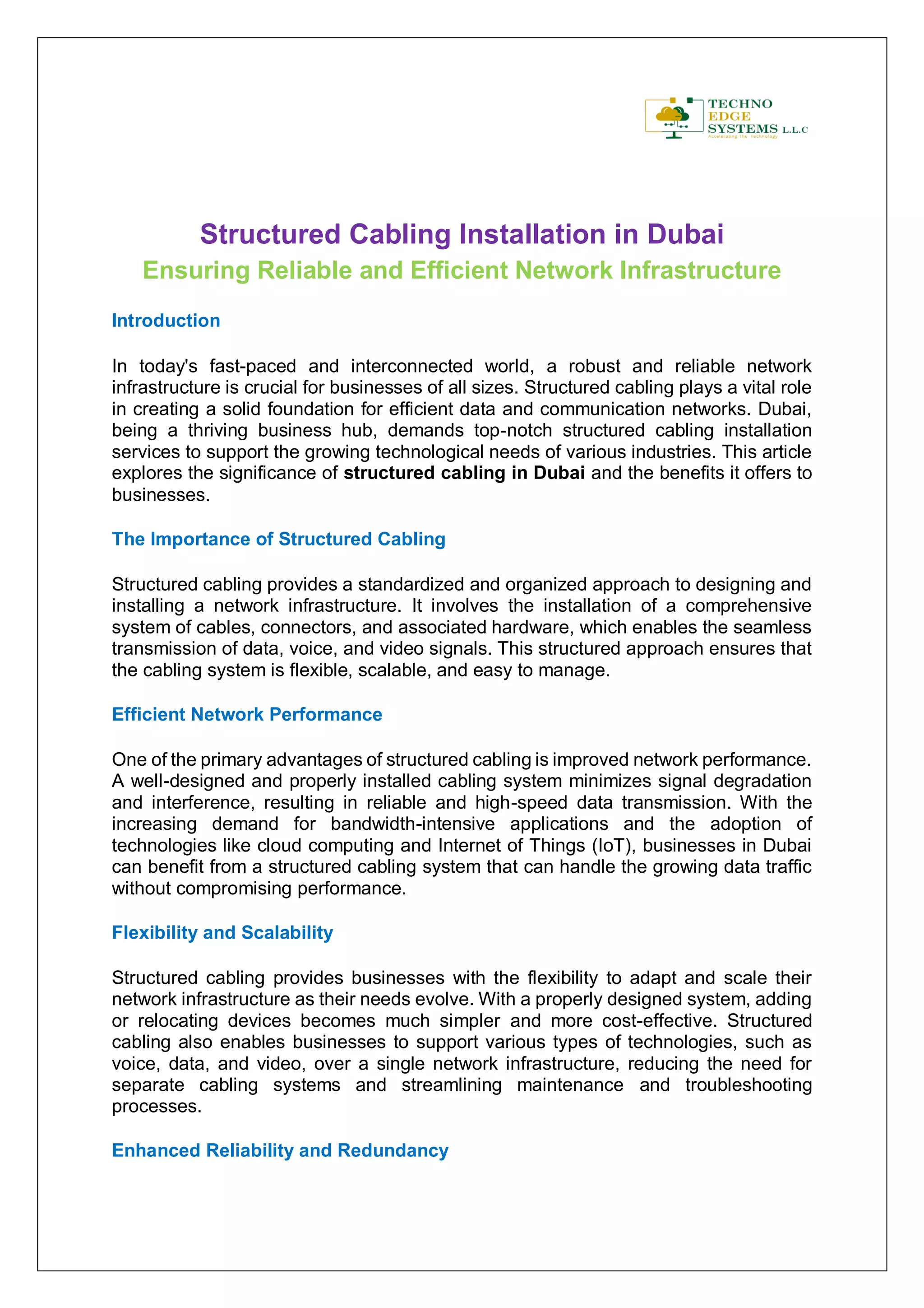 Structured cabling is essential for creating efficient network infrastructures in Dubai's fast-paced business environment, providing reliability, flexibility, and scalability. It significantly improves network performance, accommodating increasing data demands while reducing operational costs through easier maintenance and the ability to support various technologies. Investing in structured cabling ensures businesses are future-proofed, minimizing the need for frequent upgrades and maintaining consistent connectivity.
