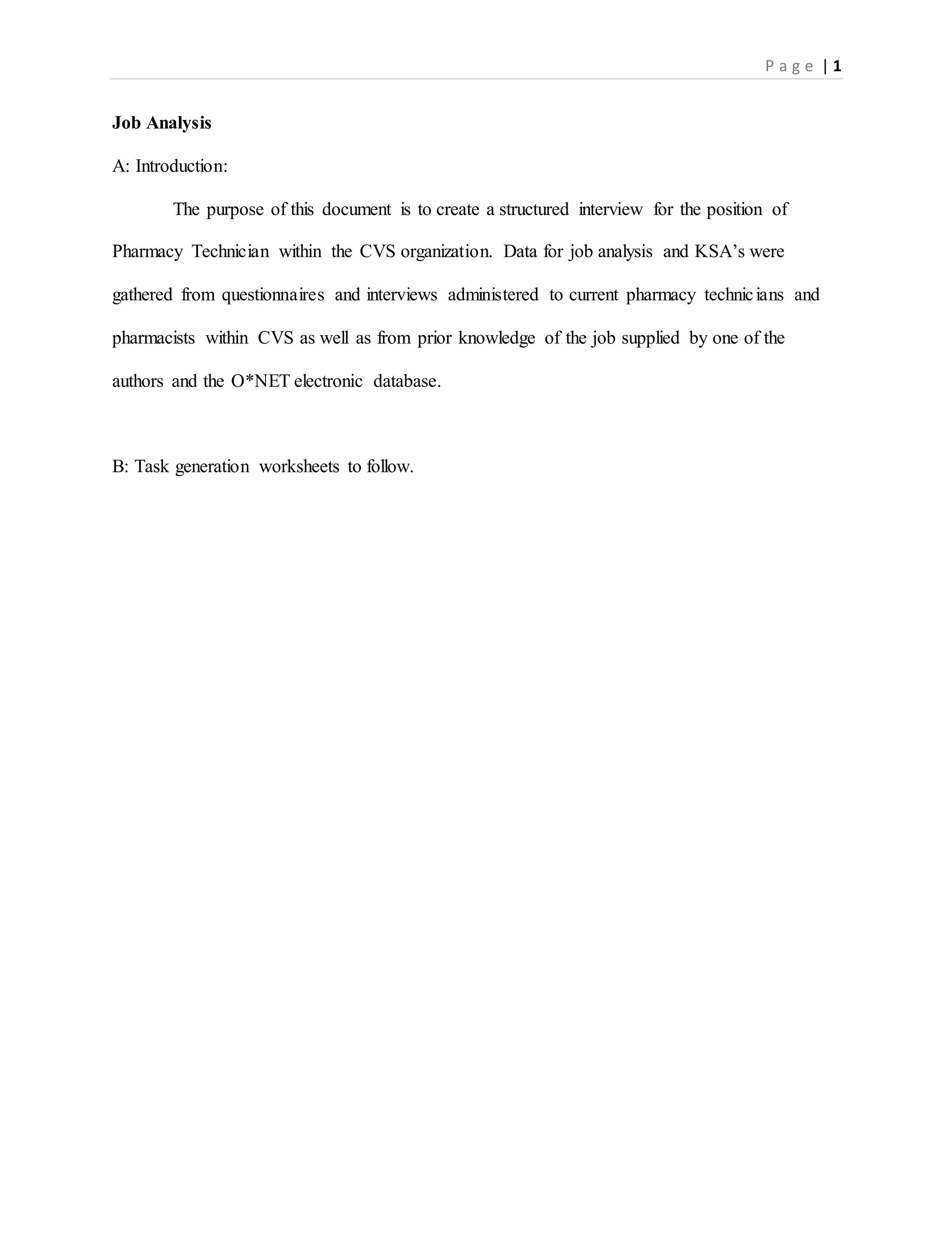 This document outlines a structured interview guide for the pharmacy technician role at CVS, detailing essential job tasks and critical knowledge, skills, and abilities (KSAs) required for the position. Key tasks include accurate medication counting, customer interactions, and managing patient information, all under time constraints that significantly impact operations. The document emphasizes the importance of specific KSAs such as manual dexterity, critical thinking, and time management that are vital for successful job performance.