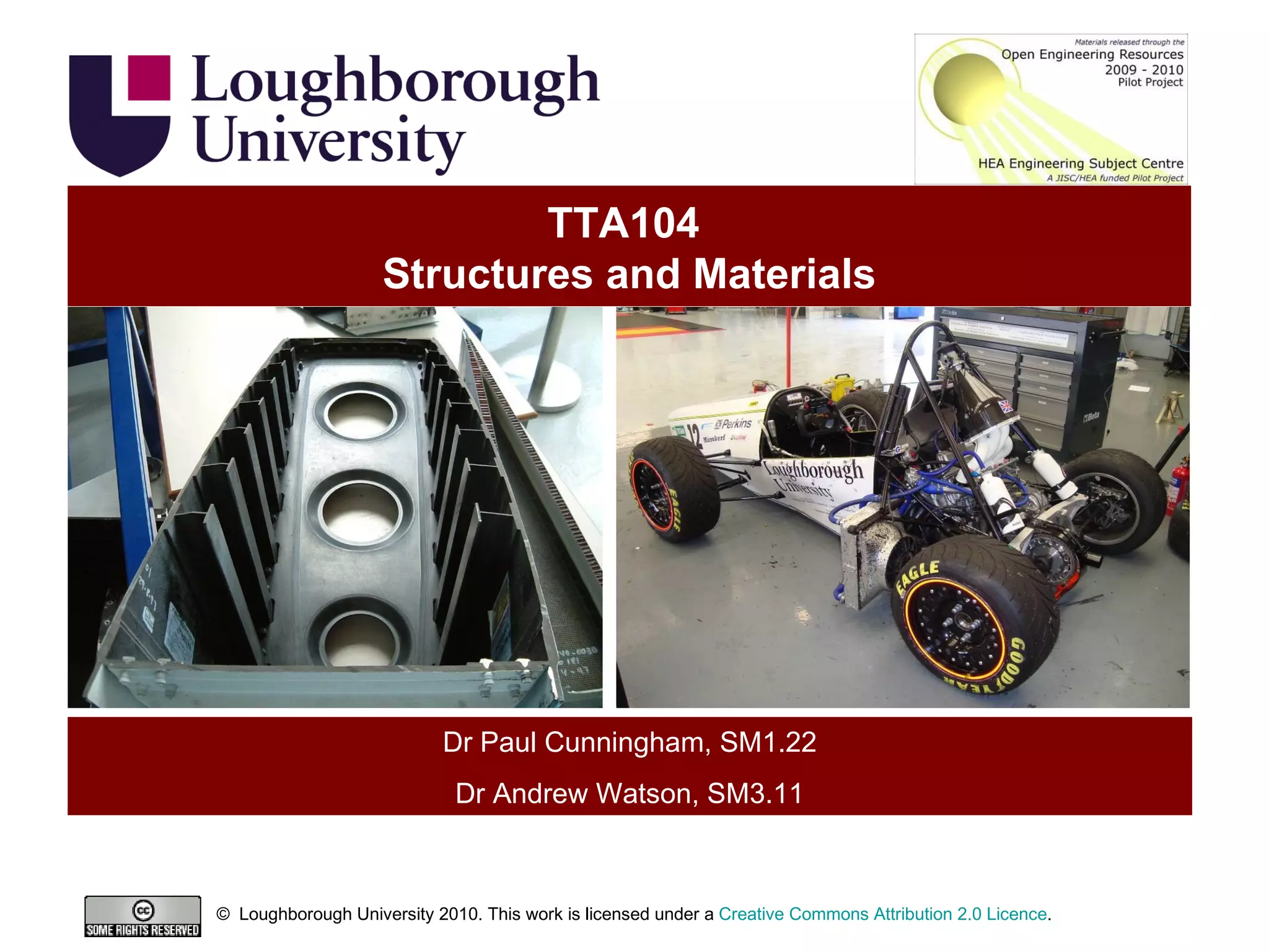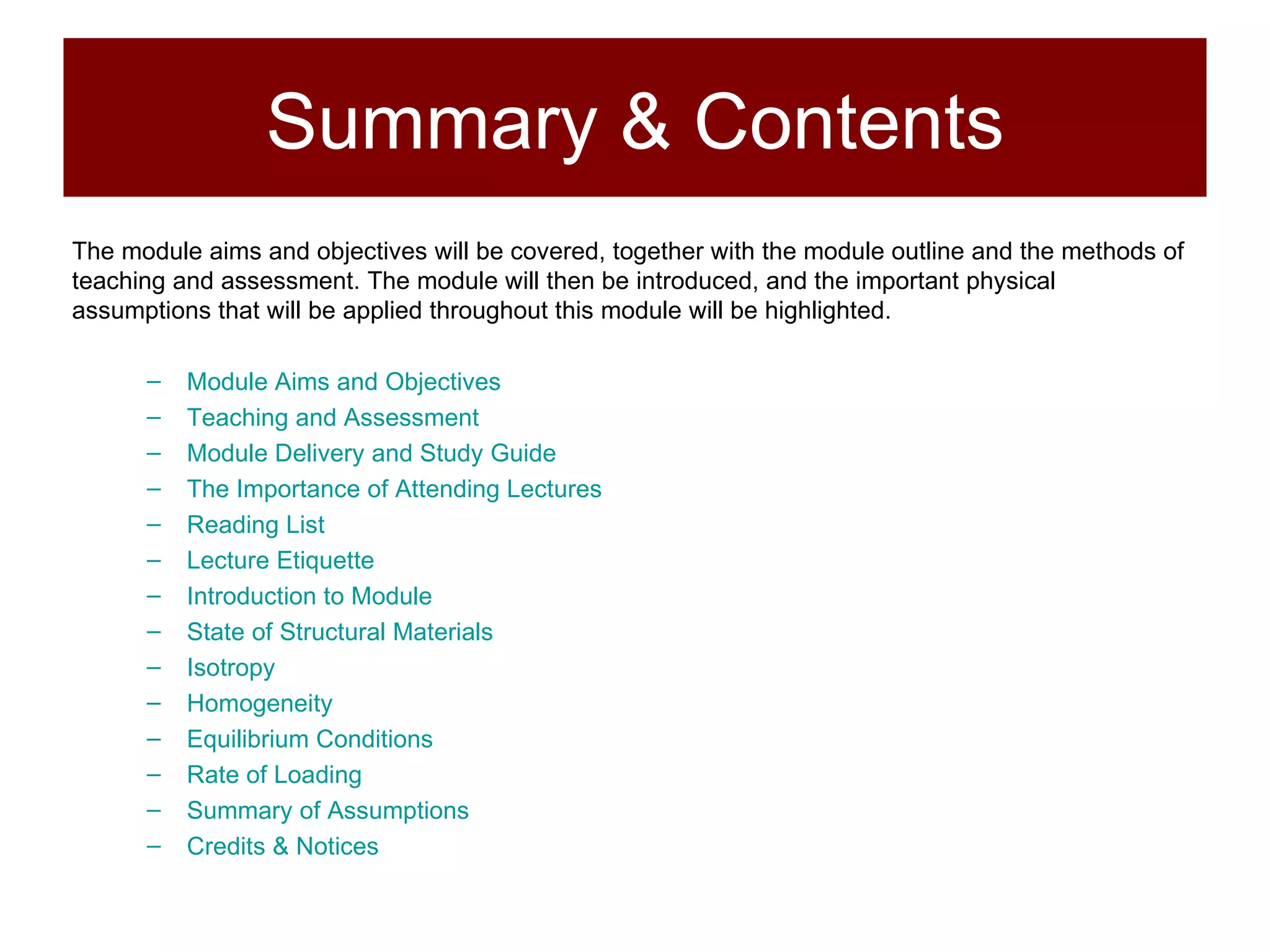 The module focuses on the analysis and design of structural components under tension, compression, and shear, highlighting essential concepts and methodologies. It includes aims, intended learning outcomes, teaching methods, and assessment details, emphasizing the importance of lectures and practical exercises. Key topics cover material properties, equilibrium conditions, and stress-strain relationships within structural engineering.