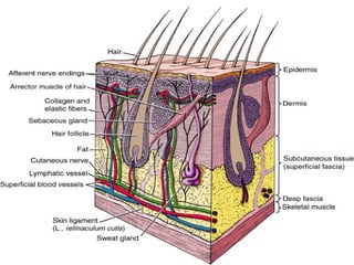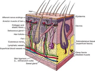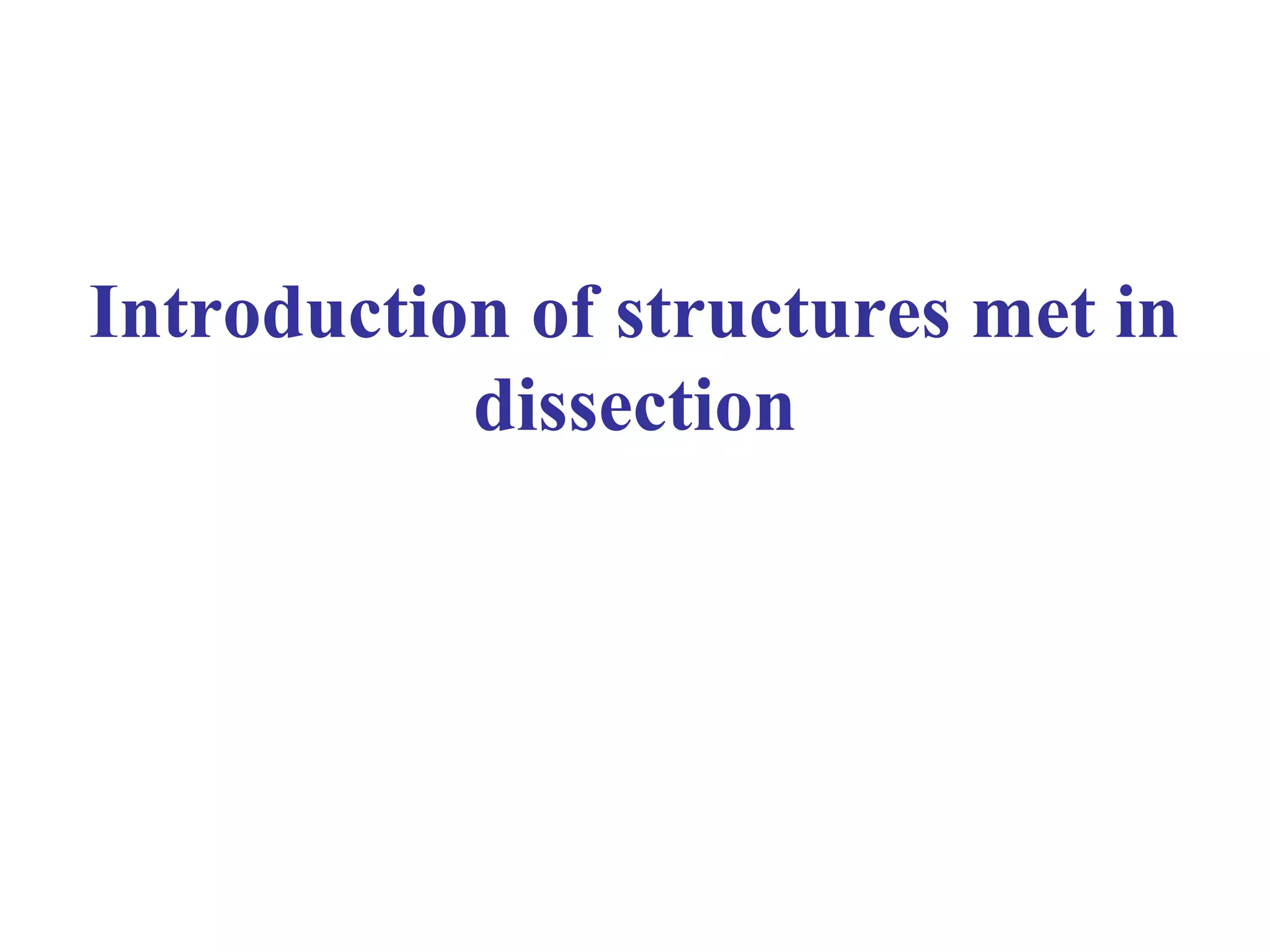 The document outlines the various structures encountered in dissection, covering the skin, fascia, muscles, and skeletal systems, detailing their functions and classifications. It discusses the skin's layers and appendages, the roles of superficial and deep fascia, the types and functions of muscles, and the skeletal system's structure and classifications. Additionally, it elaborates on joint classifications and the significance of bones in supporting and protecting the body.