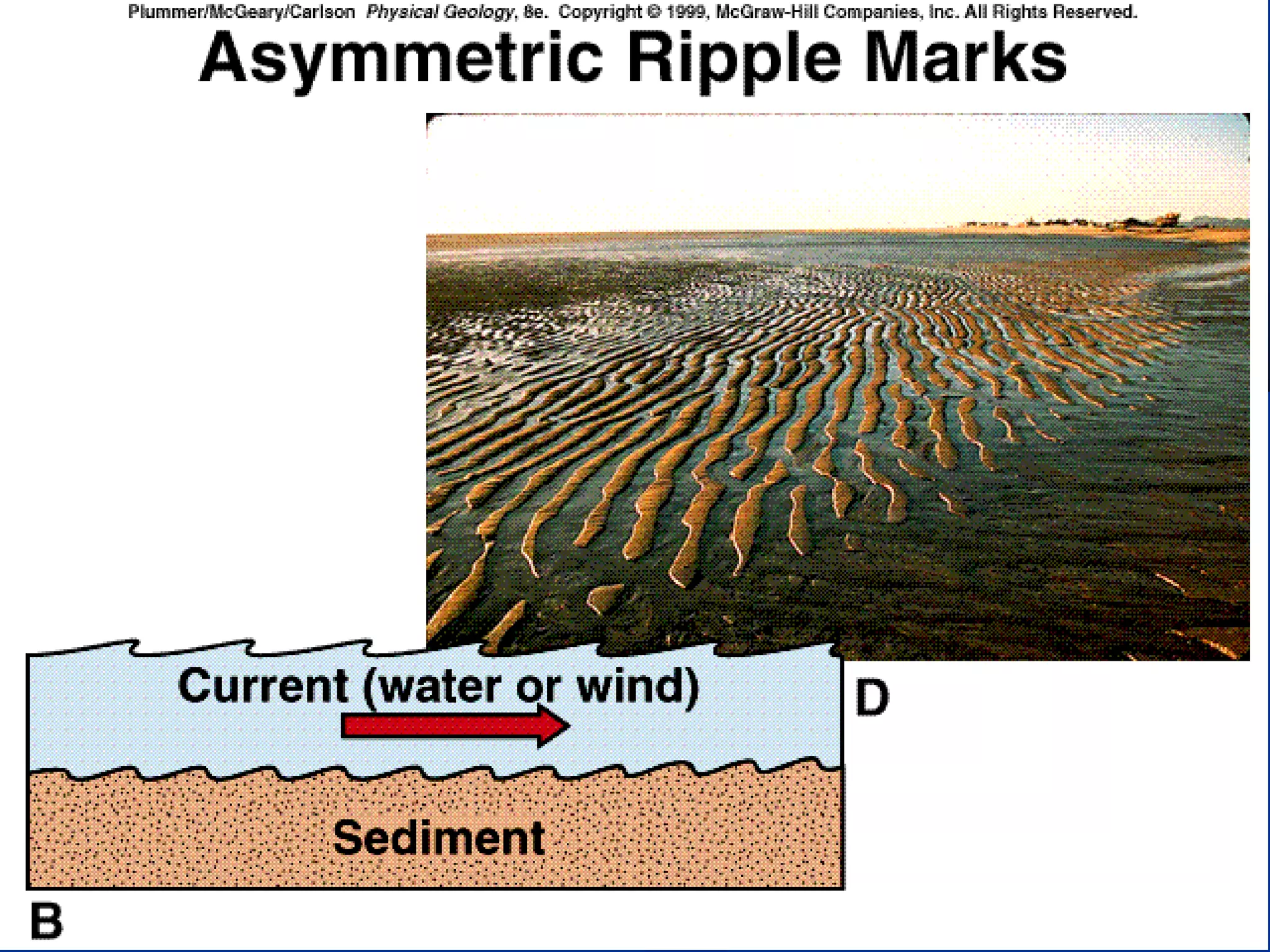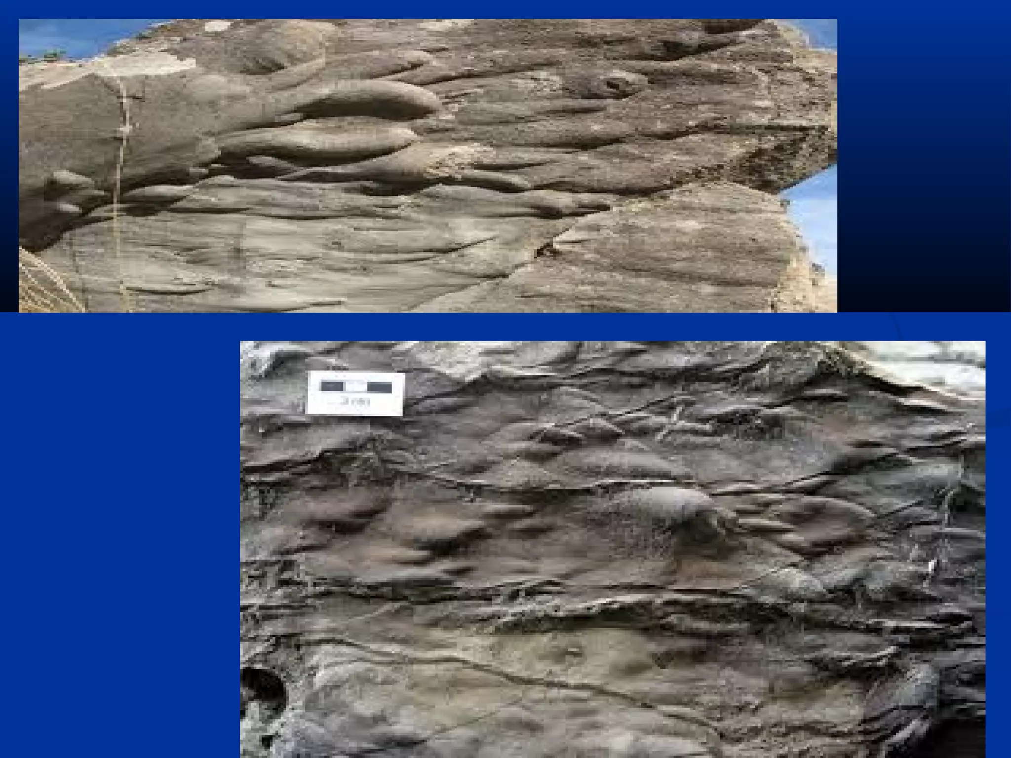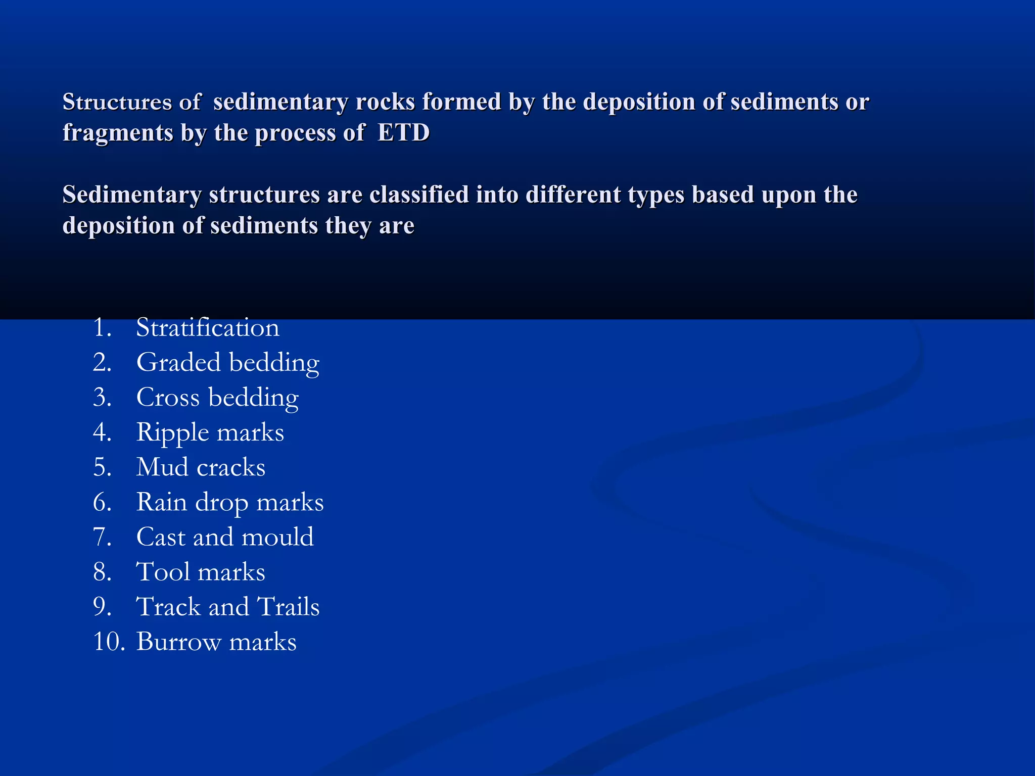 Sedimentary rocks form through the deposition of sediments or fragments by processes like erosion, transportation, and deposition. Sedimentary structures are classified based on how the sediments were deposited and include stratification, graded bedding, cross-bedding, ripple marks, mud cracks, rain drop marks, casts and molds, tool marks, tracks and trails, and burrow marks. Sedimentary rocks also include chemical rocks like limestone and dolomite formed from mineral precipitation, and biochemical rocks like coal and fossil-bearing limestone formed from organic materials.