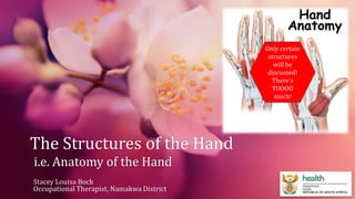 The document provides an overview of the human hand's anatomy, covering its bones, ligaments, muscles, and innervation, along with common hand conditions such as arthritis, Dupuytren's contracture, carpal tunnel syndrome, and trigger finger. Key anatomical features include the hand's 27 bones, its arches, and the role of various muscles in hand movements. It emphasizes the complexity and functional significance of the hand in prehensile activities and tactile feedback.
