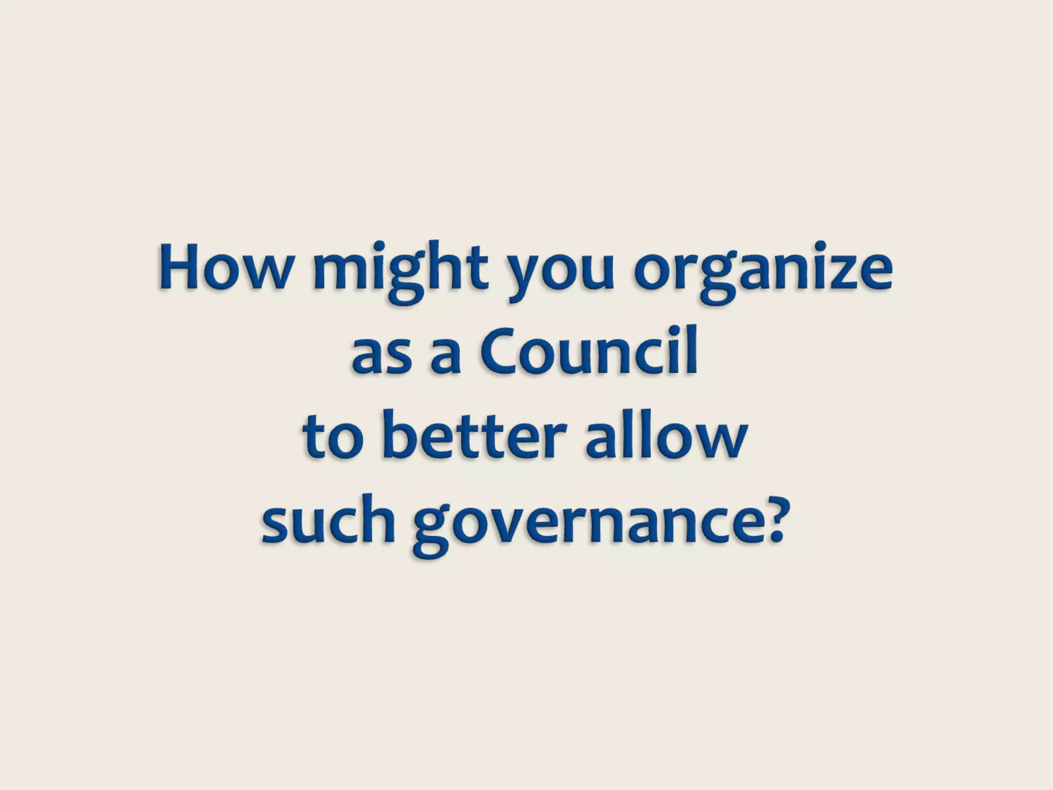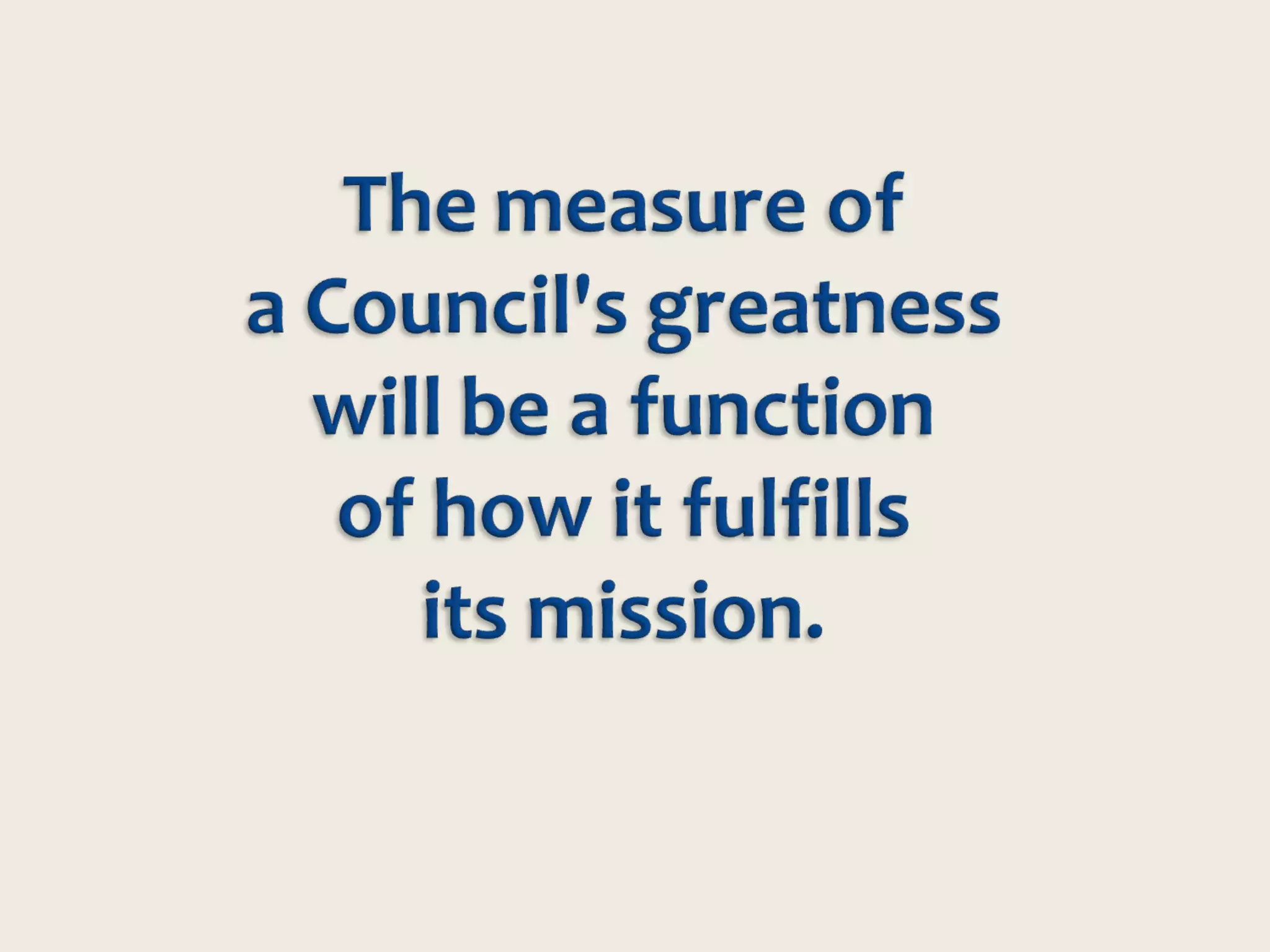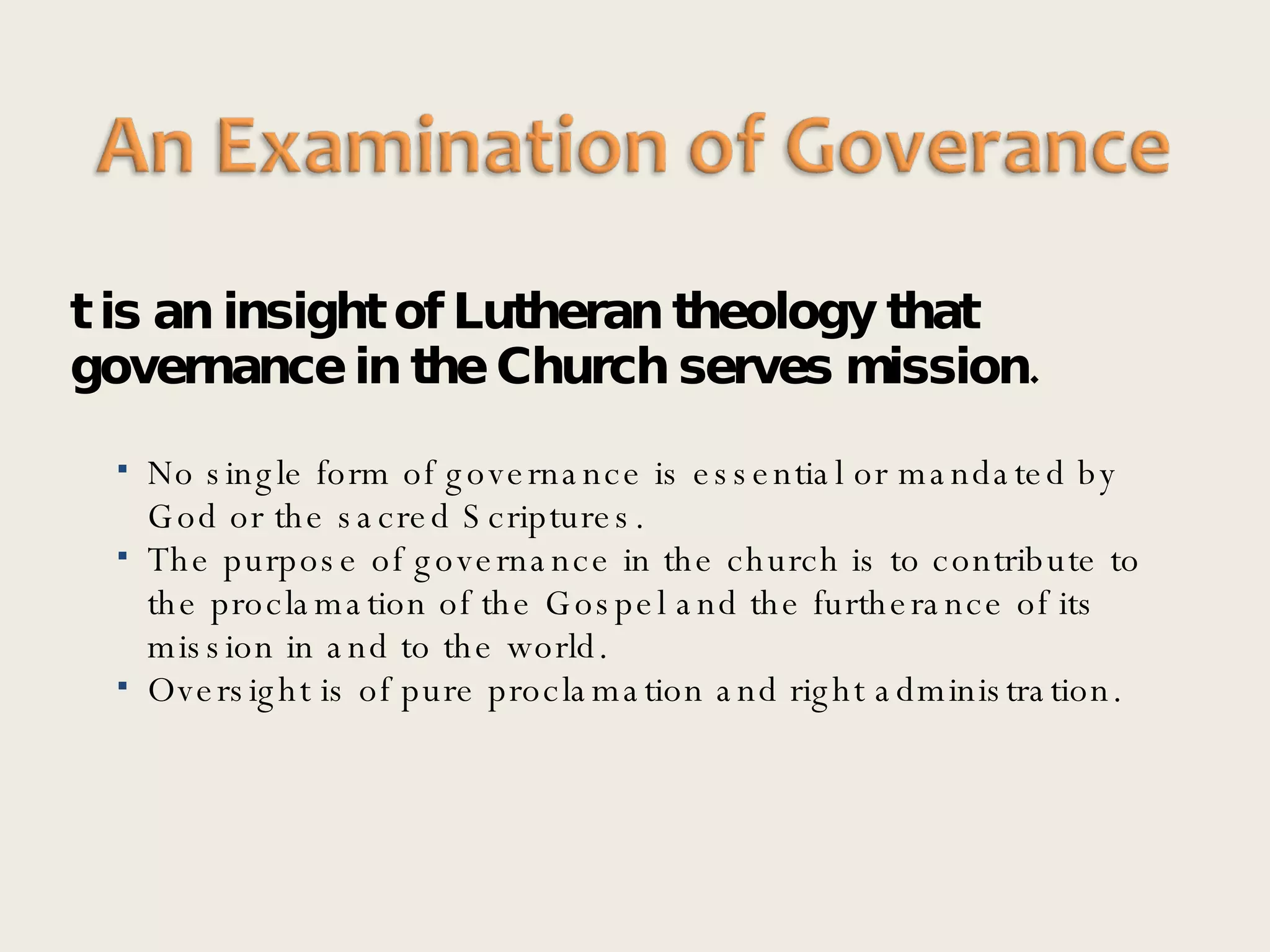 The document discusses governance in the church and its purpose of furthering the church's mission. It notes that no single form of governance is mandated by God. Effective councils serve the congregation and Christ's mission by making a distinctive impact relative to their resources. Councils should deliver exceptional long-term results beyond individuals and ideas. Councils have the power of language, mission, and committed leaders to advance their shared purpose under Christ. Most councils currently focus on fiduciary duties, but could become more proactive in strategic planning and generating ideas to further the mission.