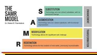 The document discusses methods for selecting learning technologies using the Padagogy Wheel, Bloom's Taxonomy, and the SAMR model. It outlines various strategies to avoid choice paralysis and improve intentional app selection for educational outcomes. Examples are provided, particularly related to a course on Aboriginal health initiatives, demonstrating how technology can enhance learning through various activities.