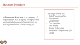 The document discusses different business structures including sole proprietorships, partnerships, corporations, cooperatives, non-profits, social enterprises, and B-Corps. Each structure has benefits and challenges. For example, a sole proprietorship gives full control but the owner bears all risks, while a corporation shows credibility but requires paperwork and reporting. The best structure depends on factors like an individual's values, skills, and goals for the business. Cooperatives require members to learn cooperation and consensus decision making. Non-profits are not intended to generate profit but can operate social enterprises. Social enterprises and B-Corps have social and environmental goals in addition to financial goals.