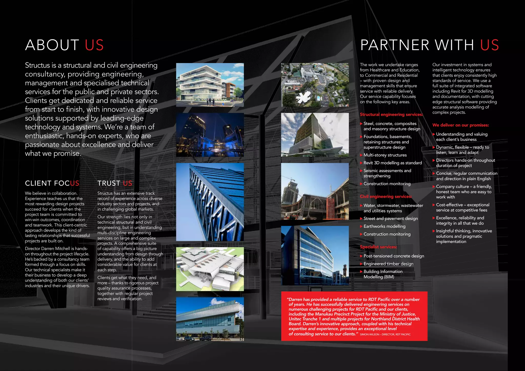 Structus Consulting Limited provides structural and civil engineering services for a variety of sectors including healthcare, education, commercial, and residential. They offer services such as structural design for steel, concrete, composites and masonry; foundation and retaining wall design; civil services including water, wastewater, and transportation infrastructure; and building information modeling. The company values excellence, partnerships with clients, reliability, vibrancy, and adaptability.