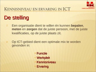 Een organisatie dientte willen én kunnen bepalen , meten en zorgen dat de juiste persoon, met de juiste kwalificaties, op de juiste plaats zit. Op ICT-gebied dient een optimale mix te worden gevonden in: Functie Werkplek Kennisniveau Ervaring De stelling