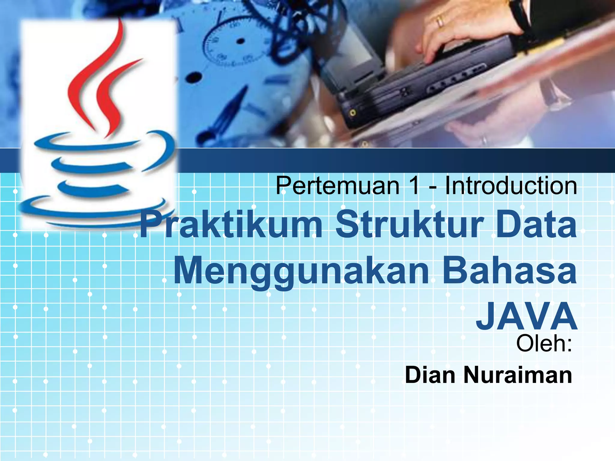 Dokumen ini berisi ringkasan materi pertemuan pertama praktikum struktur data menggunakan bahasa Java. Materi yang disajikan meliputi pengenalan Java, review pemrograman dasar, pengenalan OOP, jenis sorting dan searching, aturan praktikum, jadwal, dan tugas yang diberikan.
