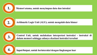 Dokumen tersebut membahas tentang struktur komputer IAS yang terdiri dari memori utama, ALU, dan unit kontrol untuk mengolah dan mengeksekusi instruksi, serta input/output untuk berinteraksi dengan lingkungan luar. Selanjutnya membahas metode mengatasi perbedaan perkembangan antara processor dengan komponen lain dengan memilih inti processor dan clock speed yang setara, serta perbedaan antara arsitektur CISC dan RISC dimana CISC mampu mengeksek