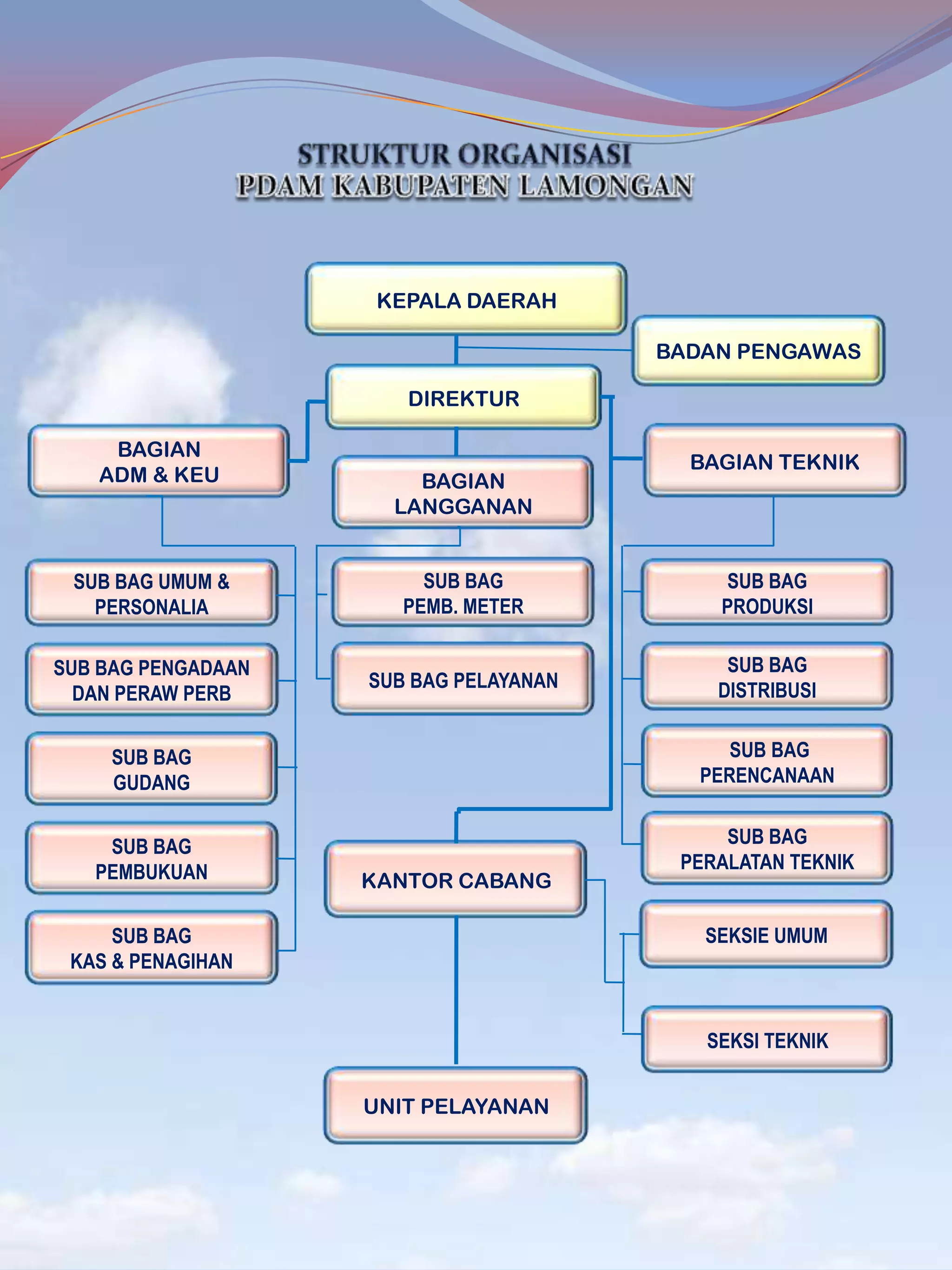 Organisasi perusahaan air minum terdiri dari kepala daerah, badan pengawas, direktur, dan beberapa bagian dan sub-bagian yang membawahi unit-unit pelayanan untuk mengelola distribusi air bersih kepada masyarakat.