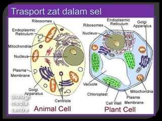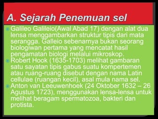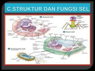 Dokumen ini menjelaskan tentang berbagai struktur dan fungsi sel, termasuk sel prokariotik dan eukariotik, organel-organel seperti mitokondria, retikulum endoplasma, dan lisosom, serta peran dinding sel pada tumbuhan. Berbagai penelitian dari ahli biologi awal seperti Galileo dan Robert Hooke juga diuraikan untuk menunjukkan perkembangan pemahaman tentang sel. Selain itu, dokumen ini membahas mekanisme transportasi zat dalam sel dan proses-proses biologis penting yang berlangsung di dalam organel sel.
