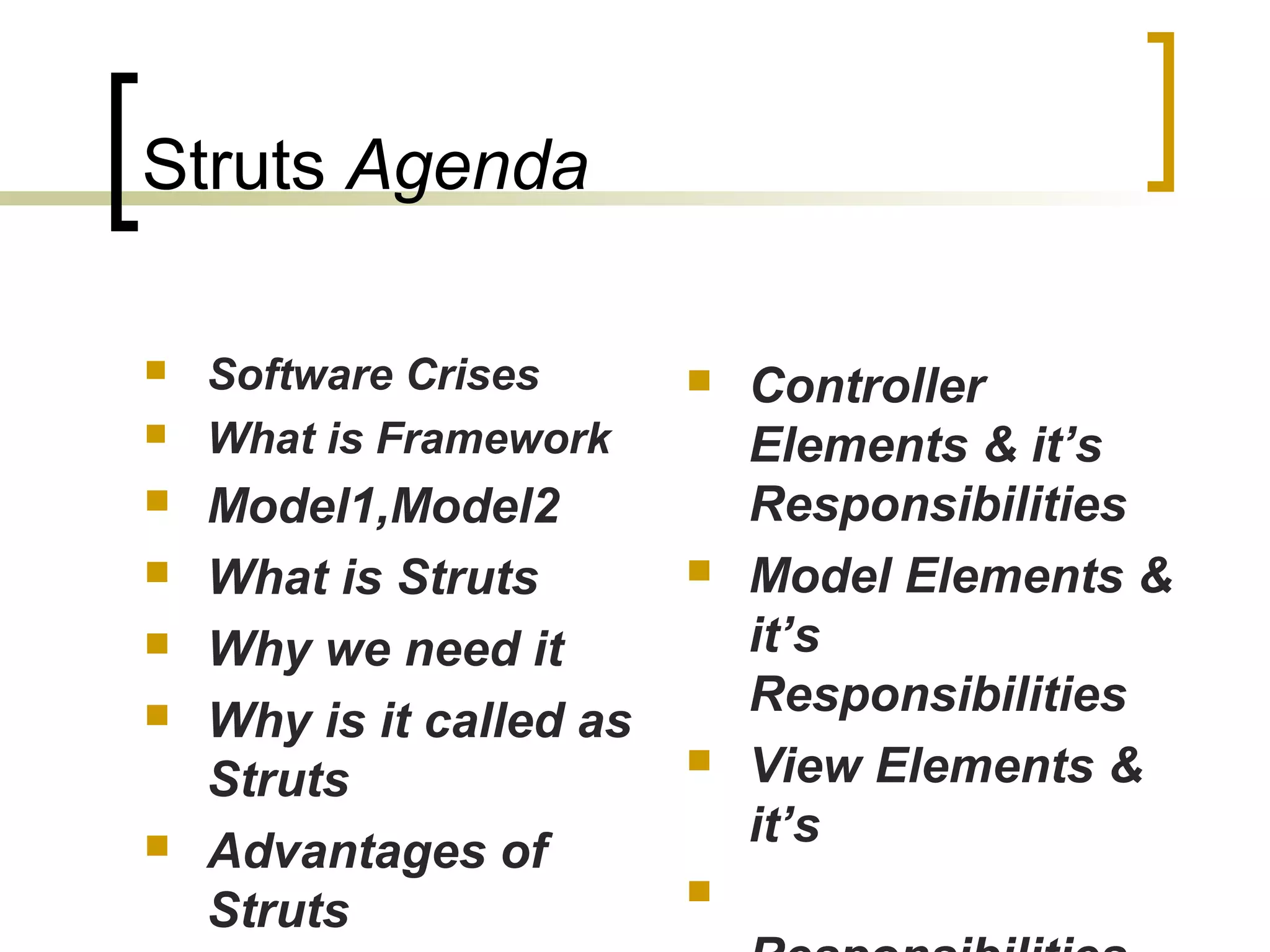 The document provides an overview of the Struts framework, including its advantages and components. It discusses the Model 1 and Model 2 architectures, and explains that Struts implements the MVC pattern. It describes the controller elements like the action servlet and request processor, the model components like Java classes and beans, and the view components like JSP tag libraries. The document also provides examples of how Struts can be implemented in a sample application.