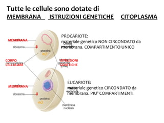 Il documento discute la struttura e le funzioni delle cellule eucariote e procariote, evidenziando le principali differenze tra di esse. Si approfondiscono le caratteristiche della membrana plasmatica, degli organuli come il nucleo, il reticolo endoplasmatico, e i mitocondri, così come il citoscheletro e le strutture sovramolecolari. Infine, viene menzionata la storia delle teorie sull'origine della vita, dalla abiogenesi alla biogenesi, fino agli esperimenti di Pasteur.