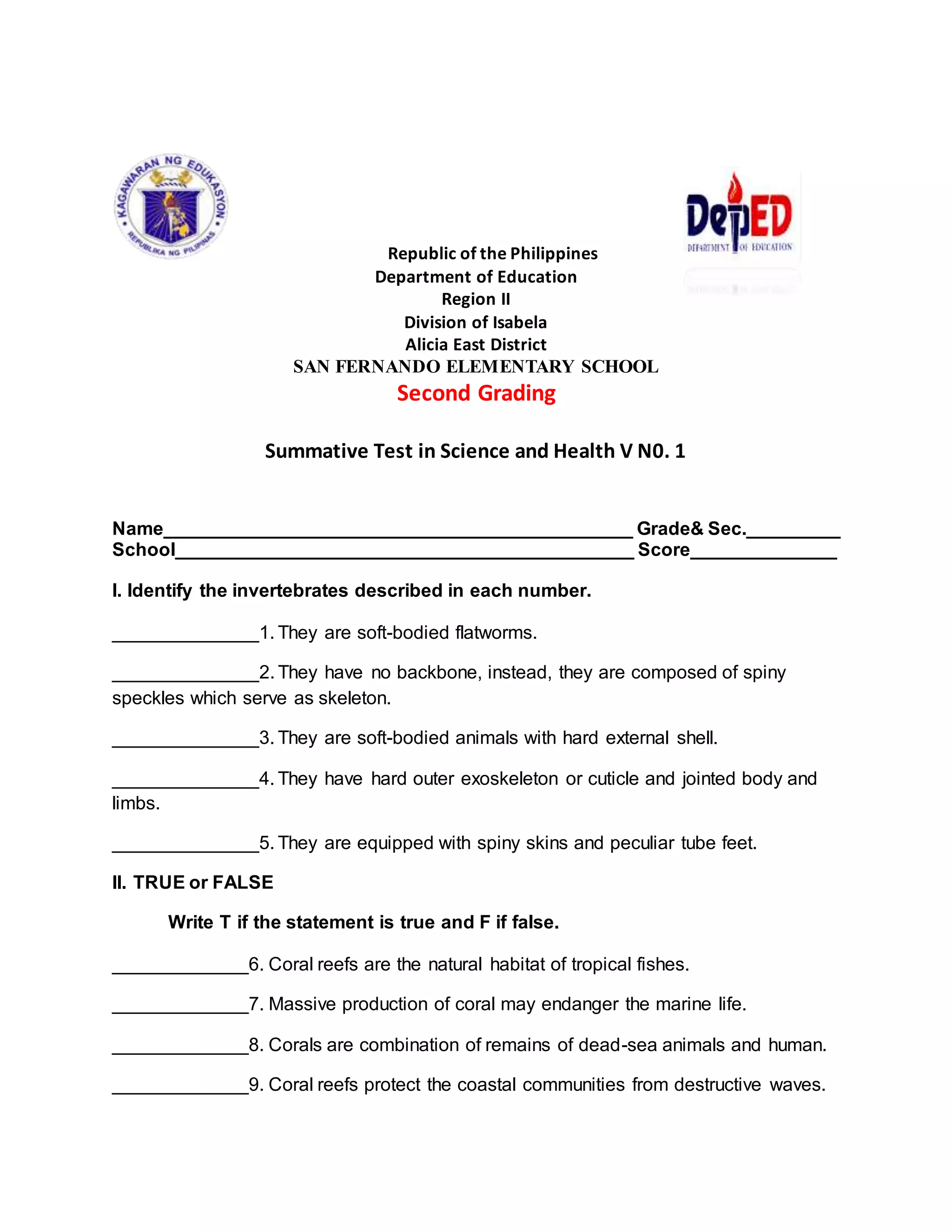 This document contains a summative test on science and health for second graders in San Fernando Elementary School. The test has four parts that assess students' knowledge of invertebrates, coral reefs, plants, and electricity. It includes identification, multiple choice, matching, and short answer questions. The test was prepared by teacher Jennifer A. Esquela and checked by principal Ericio A. Lorenzo.