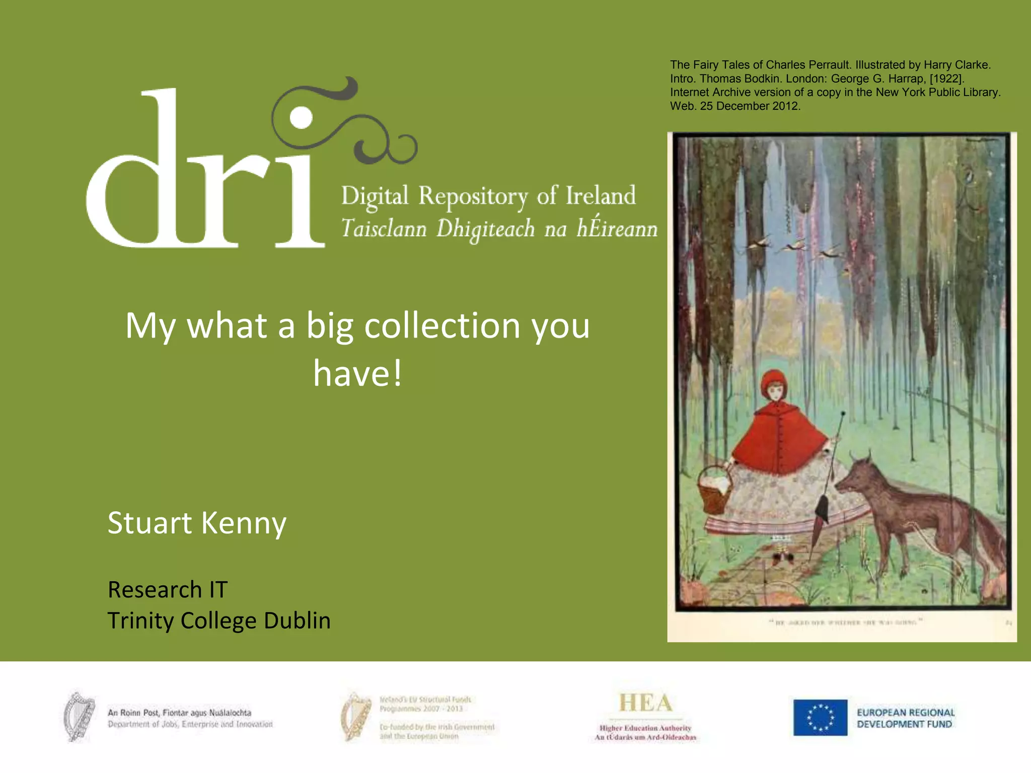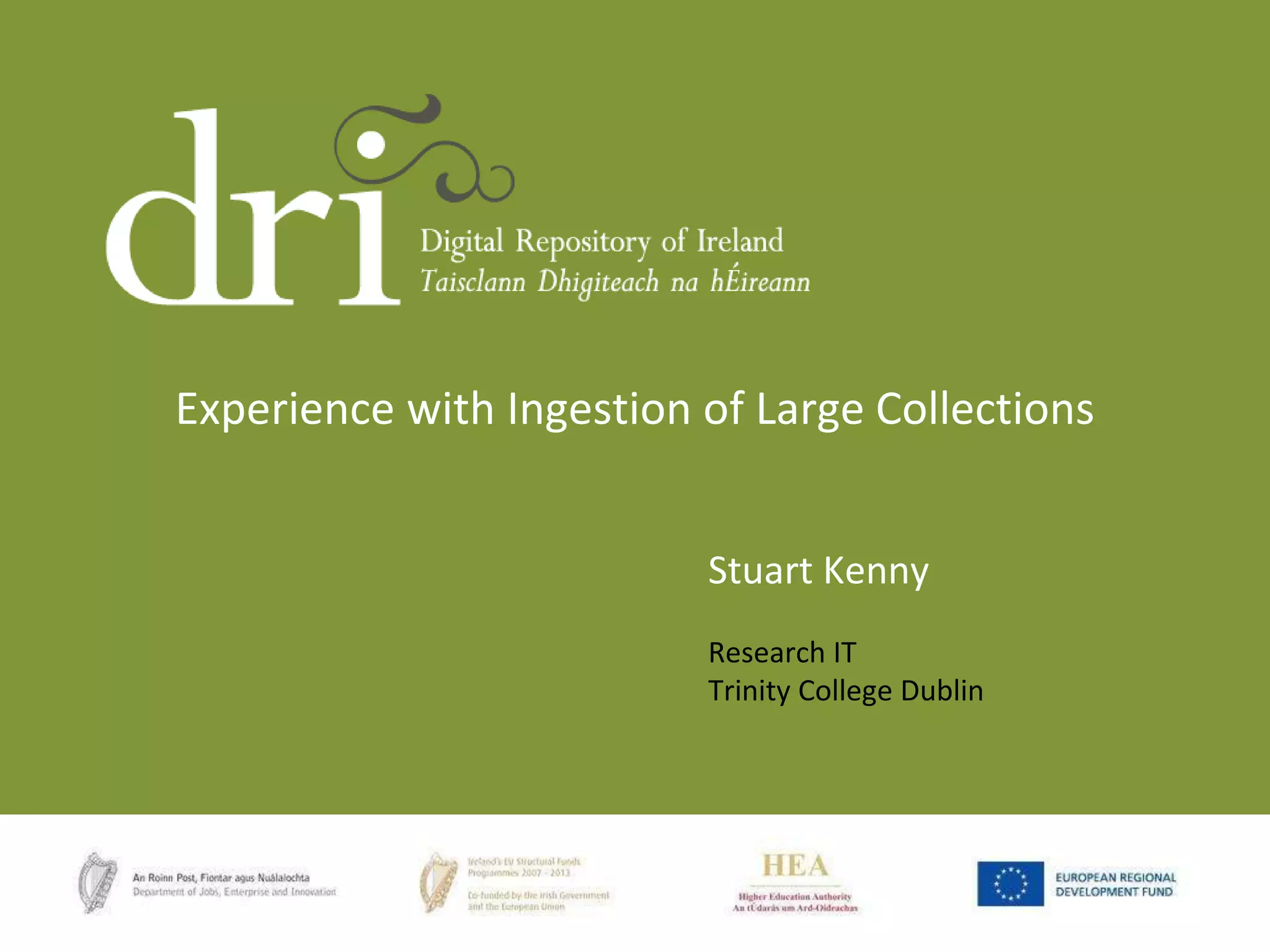 The document discusses the challenges and solutions related to ingesting large collections of cultural and historical data at Trinity College Dublin's digital repository. It details various collection examples, metadata standards, and current and potential ingest processes, highlighting issues such as slow ingestion, errors, and metadata complexity. The proposed improvements include a web-based interface for easier uploads and a background processing system to enhance efficiency.