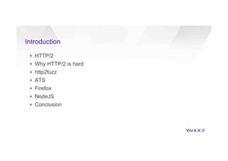 This document discusses attacking HTTP/2 implementations by fuzzing them with malformed requests. It introduces http2fuzz, an open source fuzzer for HTTP/2 written in Go. Using http2fuzz, the authors discovered crashes in the Apache Traffic Server and Firefox HTTP/2 implementations by sending unexpected or invalid frame types and payloads. Fuzzing uncovered vulnerabilities like out-of-bounds memory accesses, integer overflows, and denial of service issues. The document emphasizes that HTTP/2 implementations must carefully validate all frame fields and control states to avoid security issues.