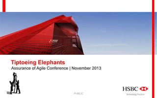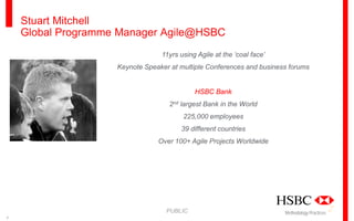 HSBC Bank uses Agile methodology for over 100 projects worldwide. Agile allows software to be delivered to production more quickly, providing a faster return on investment. However, increased governance requirements in the financial industry have slowed software delivery timelines. Agile acts as a "glue" to balance governance needs with the speed of software delivery to production, if implemented appropriately. The project manager plays a key role in navigating governance requirements while maintaining development momentum.