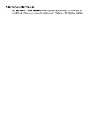 The document provides instructions for students to register for the Spring 2014 Lund MyStudentSuccessLab Late Start course on Pearson MyLab & Mastering. It outlines 6 steps for initial registration which includes entering the instructor's course ID, signing in or creating a Pearson account, selecting an access option using a code, credit card, PayPal or temporary access, and clicking to access the course materials. It also notes that returning students can sign in using existing Pearson credentials without paying again.