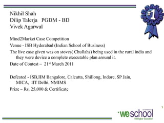 Student achievers from SIBM Pune participated and won prizes in various inter-college competitions from January 2011 to March 2011. These competitions included case study competitions, business plan competitions, marketing campaigns and more. SIBM students defeated teams from IIMs, IITs, NMIMS and other top B-schools to win prizes ranging from certificates to cash awards worth thousands.
