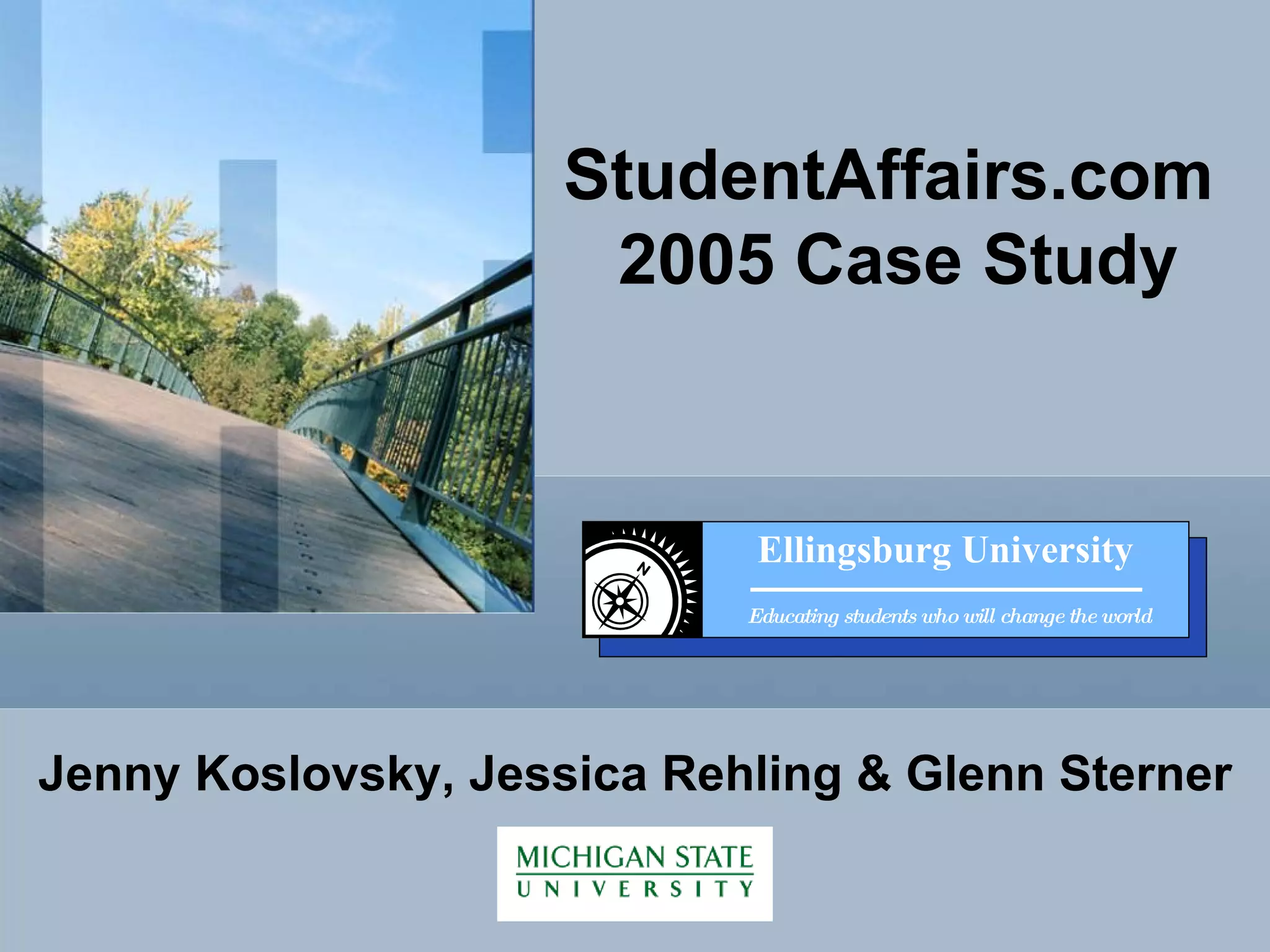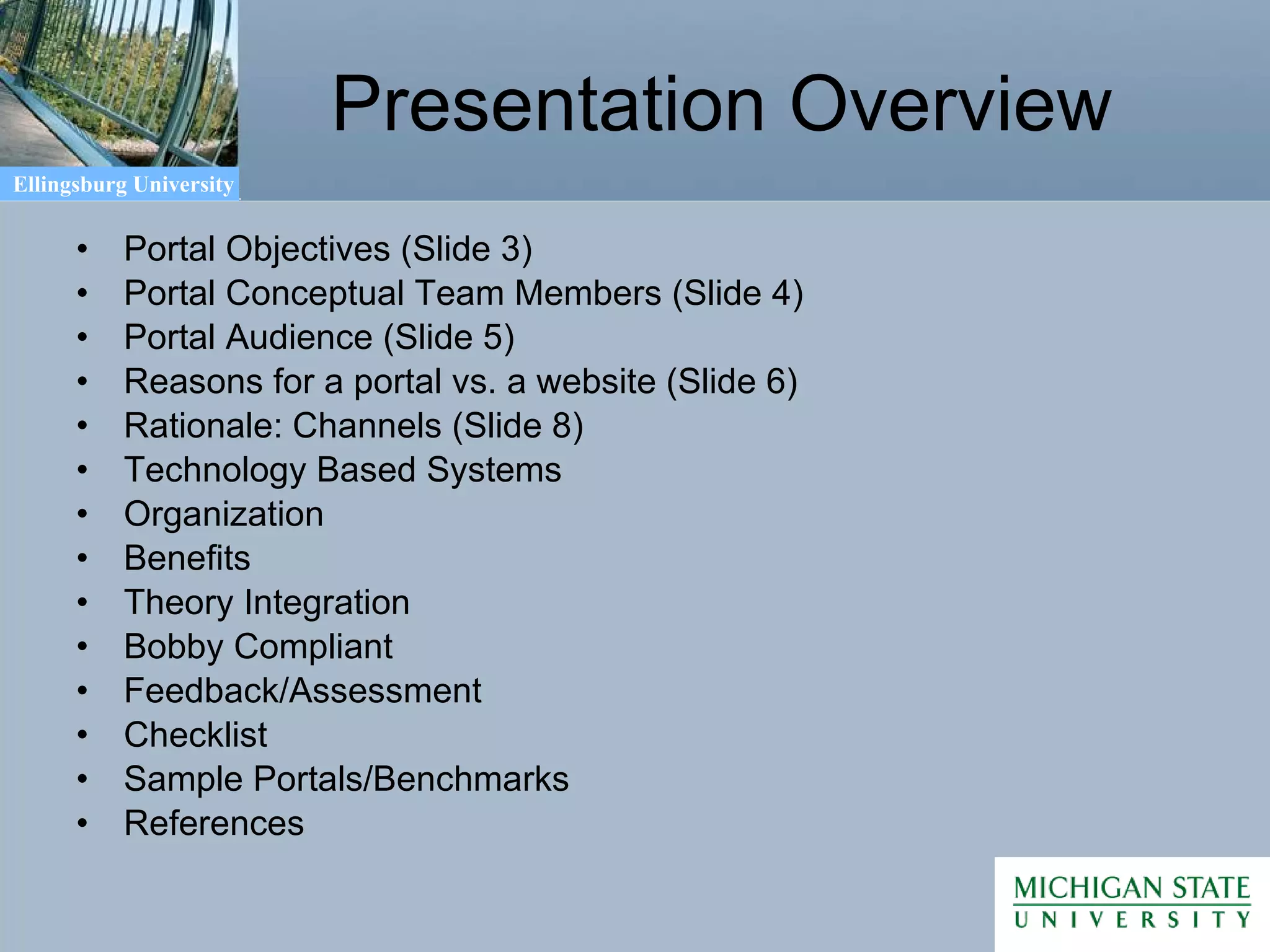 The document discusses a case study for creating an online portal for Ellingsburg University. It outlines objectives for the portal, proposed channels and content for different user groups, and a rationale for each channel. It also discusses technology to be used, organizational structure, potential benefits, and theories and standards to guide the portal's development.