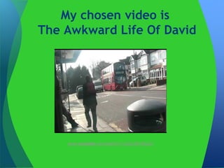 This video is a comedy about a boy named David who is trying to get the attention of a girl he sees every morning at the bus stop. He engages in awkward antics across the week to win her over, not realizing that she is deaf. The video follows David's clumsy efforts through close-ups and scenes showing his daily routine and interactions with the girl at the bus stop.