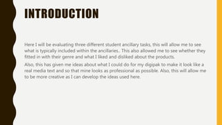 The document provides an analysis of three student ancillary tasks evaluating digipaks from different bands. For the Arctic Monkeys digipak, the student likes the fonts and color scheme but finds the images hard to make out. For the mise-en-scene analysis, the student notes the casual costume fits the indie rock genre. The Sum 41 digipak fonts are hard to read and the band photo needs flipping. The Canopy Climbers digipak uses plain colors and fitting inside images, but the front fonts feel unprofessional.