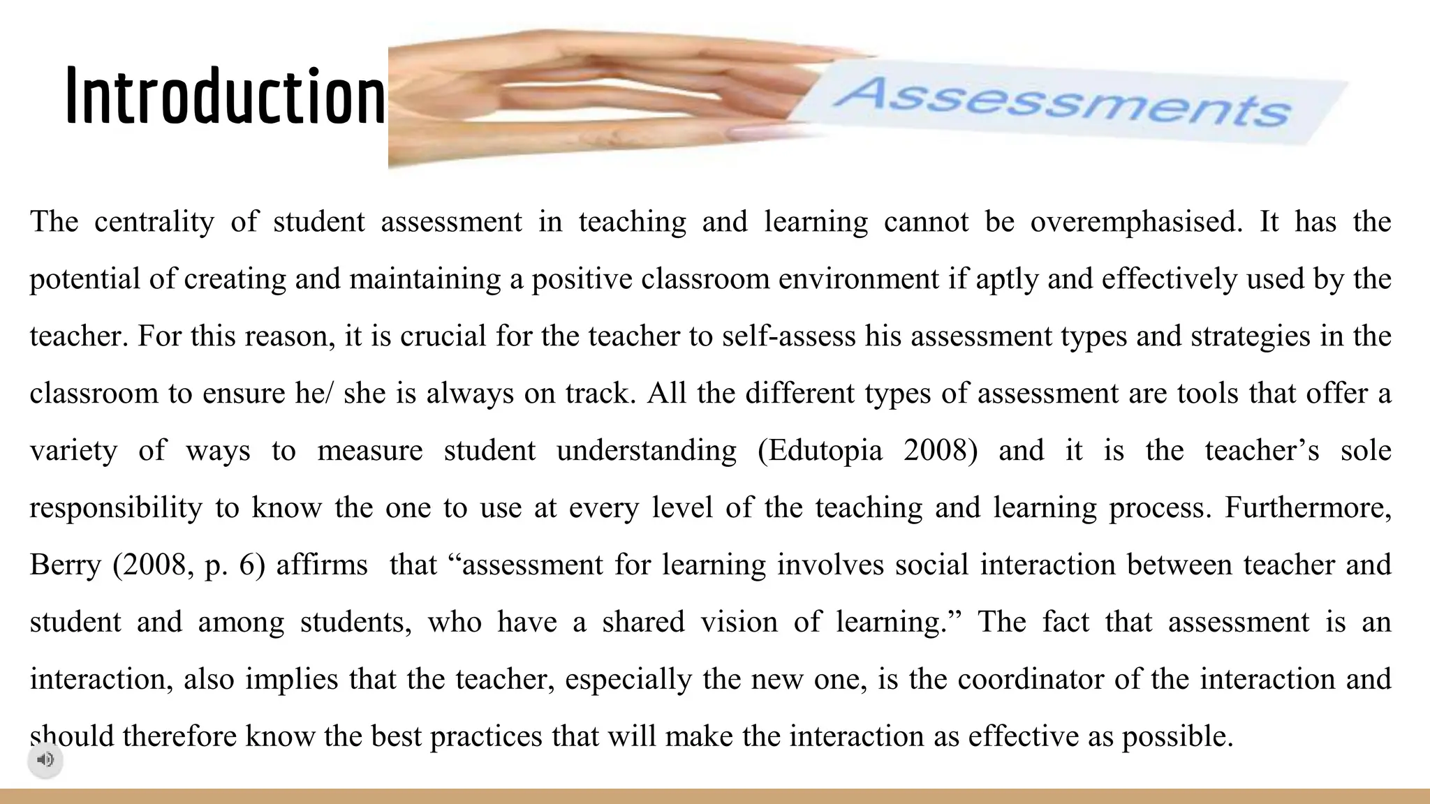 The document discusses the significance of student assessment in fostering a positive classroom environment, emphasizing the need for teachers to self-assess their assessment strategies. It outlines various types of assessments—formative, summative, and alternative—detailing their roles, benefits, and real-life applications, while highlighting how formative and alternative assessments can engage students more effectively than summative assessments. Additionally, it emphasizes best practices for implementing these assessments to enhance student learning and motivation.