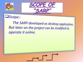 This document describes SARP, a desktop application software developed for daily student and staff attendance in institutes. SARP allows administrators and users to enter and access attendance information, generate reports, and monitor attendance. It was developed to computerize the traditional paper-based attendance system and automatically generate reports. The document outlines the group members, features, system requirements, data flow diagrams, user types, sample entries, advantages, and references used in developing SARP.