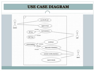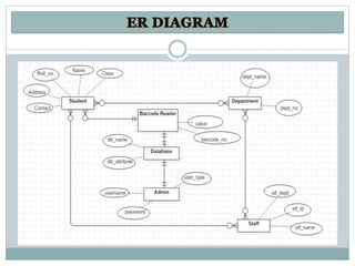The document describes a student attendance tracking system that uses barcode scanning. Each student receives a unique barcode card. Students scan their cards at the start of each class, and the system records their attendance. It stores all student attendance records and can generate lists of absent students. The proposed system aims to reduce paperwork and save time compared to the manual attendance recording process.