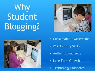 The document discusses the importance of student blogging as a tool for learning 21st-century skills and creating a digital portfolio that is accessible to a wider audience. It highlights how blogging empowers students to protect their personal information, make positive digital footprints, and engage with authentic audiences while also enabling long-term academic and personal growth. Additionally, it provides resources for teachers to start blogging in their classrooms and aligns blogging practices with educational standards.