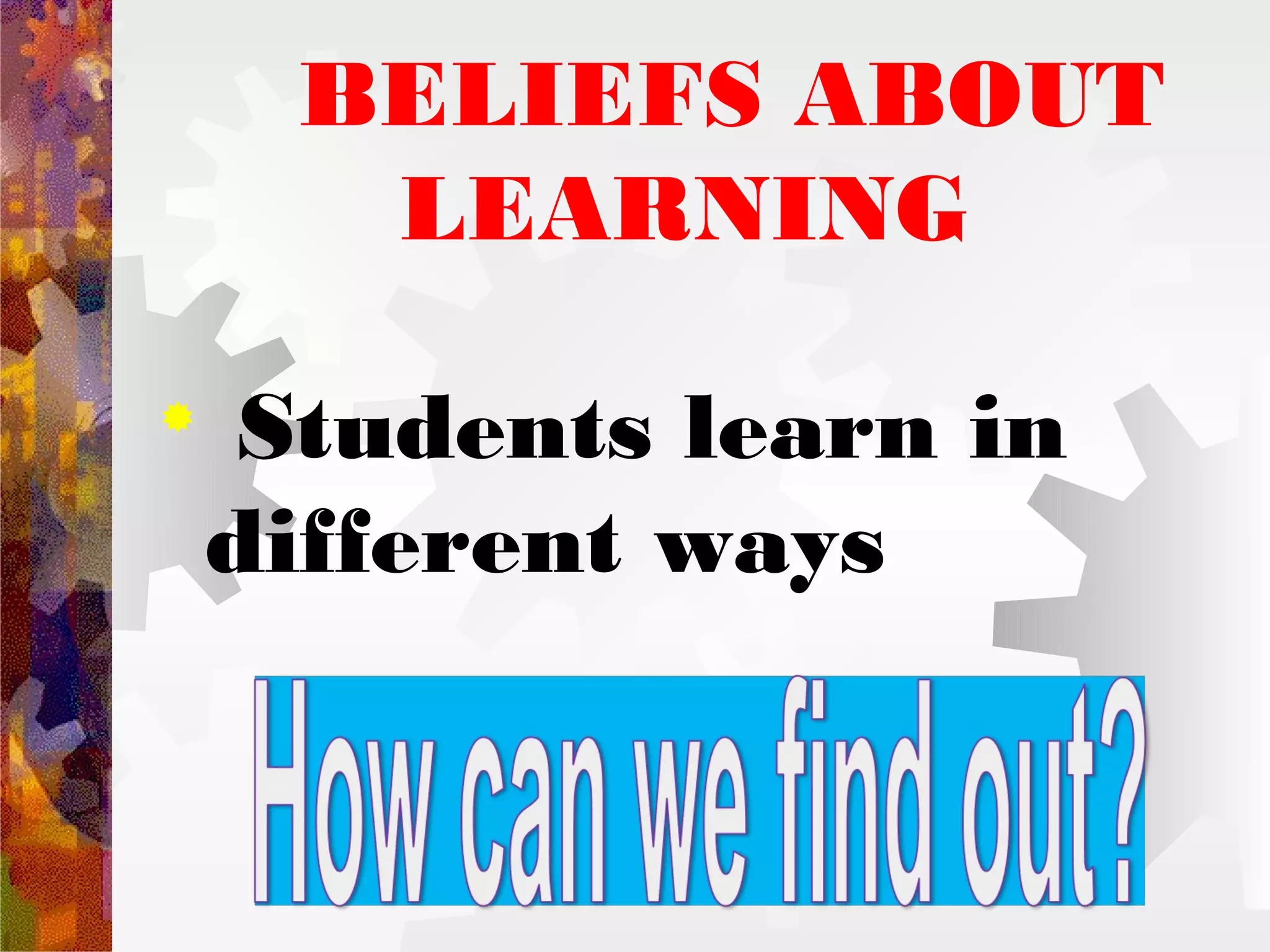 This document discusses the student-centered approach to learning. It presents several key beliefs: that students learn in different ways, learning is an active process, students are engaged when involved, and knowledge is built internally. The workshop teaches the characteristics of student-centered classes, where students do 80% of the work and teachers organize 20%. An activity checklist is provided to ensure activities include prediction, self-discovery, involvement, application of knowledge, and varied interaction patterns. Benefits of the student-centered approach for both students and teachers are outlined.