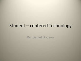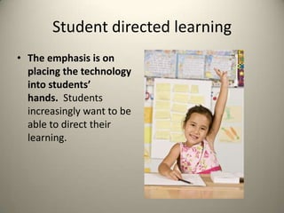 Student-centered technology places more control and resources in students' hands for directing their own learning, with teachers acting as facilitators to guide students in filtering online information. As technology becomes more integrated into professional development and classrooms, digital textbooks and e-readers will allow instant access to updated content while reducing paper and oil consumption compared to physical textbooks that require production and shipping. Educators should leverage students' engagement with social networking to develop creative learning environments online.