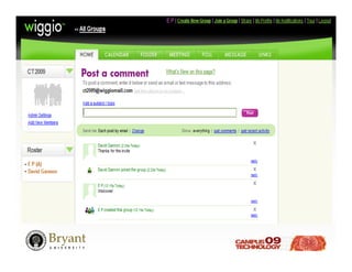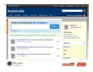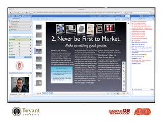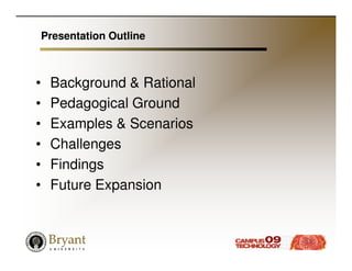 This document outlines examples of how technology can facilitate student collaboration across barriers of space and time. It discusses challenges modern students face in collaborating due to schedules, commuting, and physical separation. It then provides several case studies of how tools like wikis, blogs, video conferencing, and annotation software allow groups to work together on tasks like project design, coordination, presentations, and evaluations. The document concludes by discussing challenges of implementing these technologies and possibilities for future expansion to other activities.