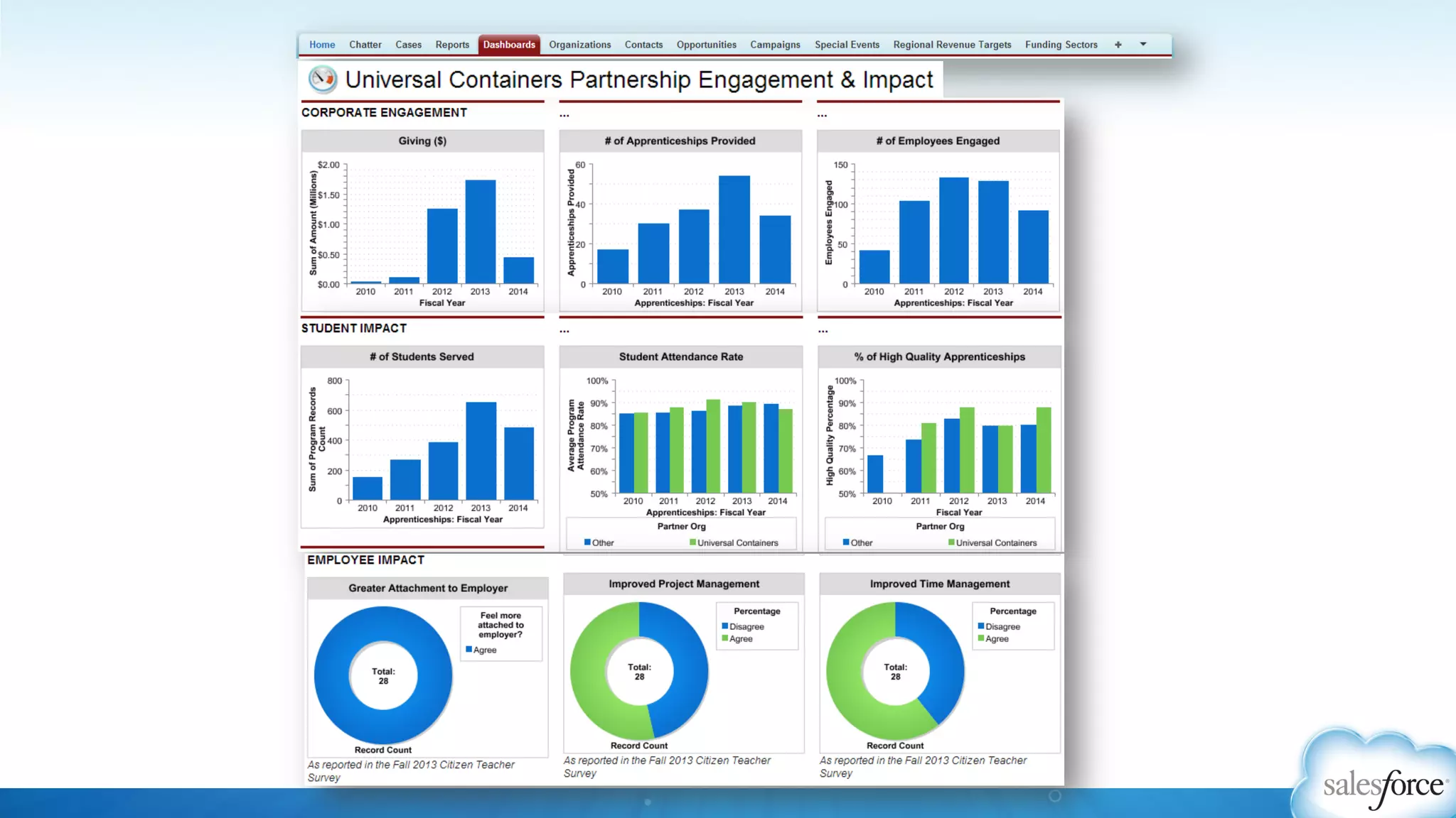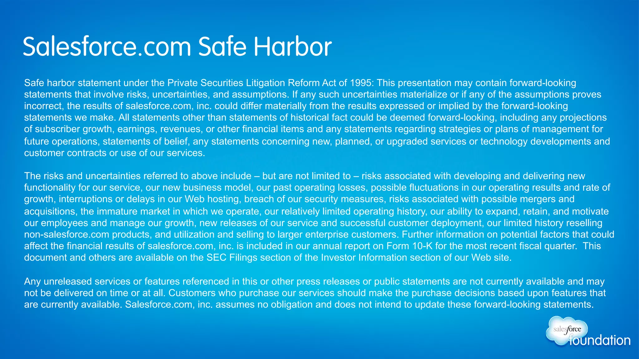 The document discusses Salesforce's commitment to supporting nonprofits through its 1:1:1 social enterprise model, which integrates product, time, and equity contributions to drive engagement and impact in the community. It highlights the experiences of various nonprofits, showcasing how they effectively utilize Salesforce applications to manage operations, improve communication, and enhance fundraising efforts. Additionally, risks associated with forward-looking statements and the evolving necessity for nonprofits to adapt to a connected environment are noted.