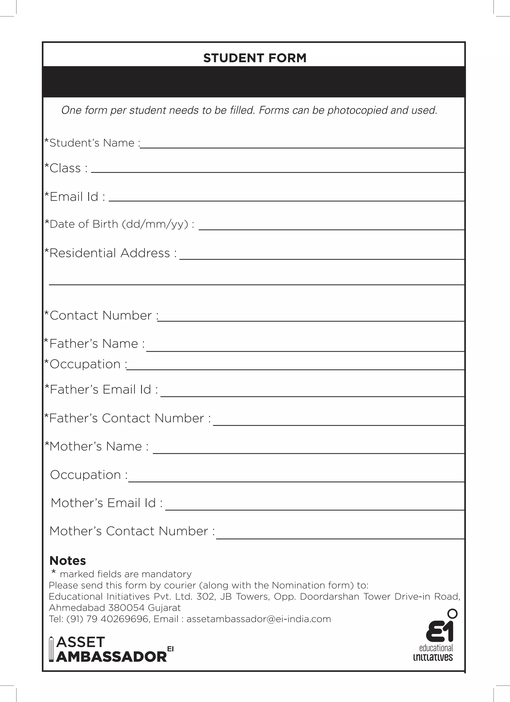 This student form collects personal information such as name, class, date of birth, contact details, and parental details. One form is required per student and can be photocopied. The completed form along with a nomination form should be couriered to the specified address for Educational Initiatives Pvt. Ltd.