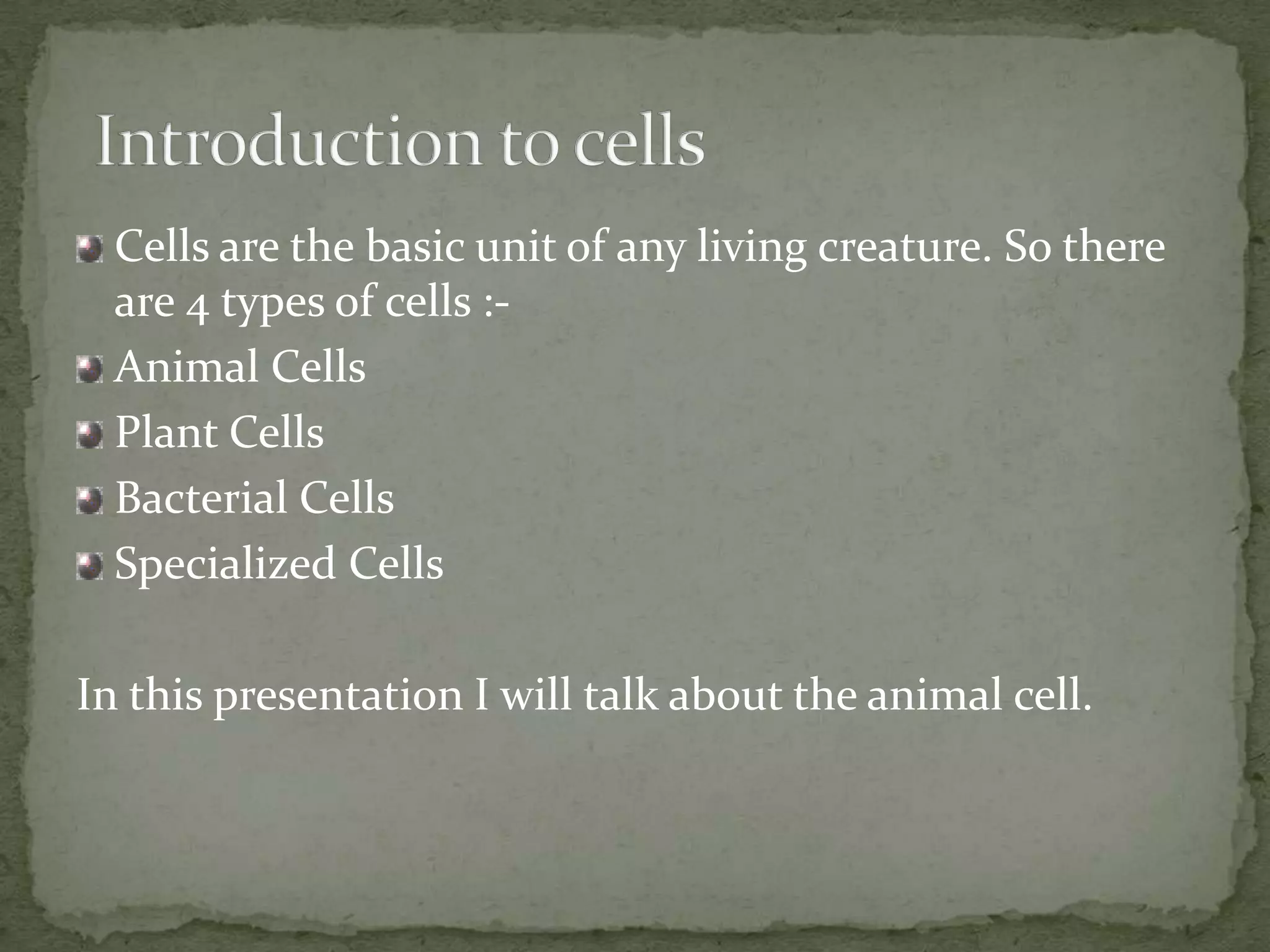 The document discusses the key organelles of an animal cell including the nucleus, ribosomes, endoplasmic reticulum, Golgi body, vacuole, lysosomes, cytoplasm, mitochondria, and cell membrane. The nucleus controls all cellular activity and contains chromatin, nucleolus, and a nuclear envelope. Ribosomes produce proteins and are located on the endoplasmic reticulum, which transports proteins and minerals within the cell. The Golgi body receives and distributes proteins and materials. The vacuole stores materials, and lysosomes break down food and cell parts. The cytoplasm and mitochondria provide structure and energy to the cell, while the cell membrane regulates what enters and exits.