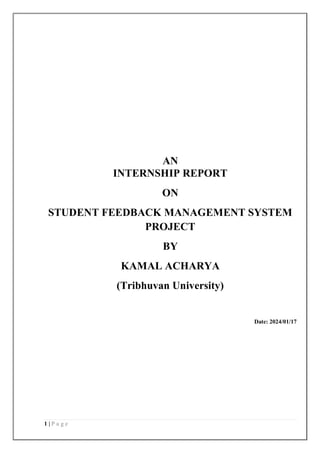 The document is an internship report detailing the development of a web-based student feedback management system aimed at engineering college students and faculty. It includes system objectives, user requirements, software design, and an analysis of user interactions, emphasizing the collection and analysis of feedback regarding teaching performance. The report highlights the system's features such as user registration, feedback submission, and results viewing, while promoting ease of use and efficiency.