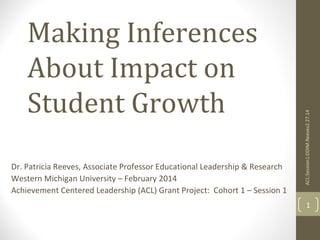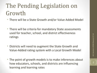 The document discusses upcoming legislation around student growth models for evaluating teachers and schools. It notes that the legislation will require districts to use state assessments to measure student growth and develop local growth models to supplement the state ratings. The document provides an overview of different types of growth models, how they work, and how they can be used to set growth targets and evaluate educators. It emphasizes that growth models are most effective when goals are aligned across the district and based on a shared definition of student success.