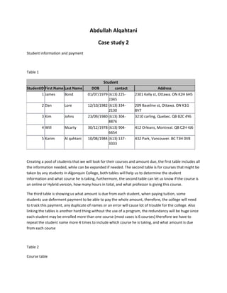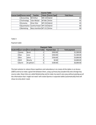 This document outlines three tables containing student, course, and payment information for a college. The student table includes details like name, ID number, contact info, and address. The course table lists course codes, names, teachers, formats, and hours. The payment table shows the amount due and total payment for each student based on their enrolled courses. Linking these tables together through primary and foreign keys would reduce redundancy and make it easier to query specific information as needed, such as a student's schedule or balance.