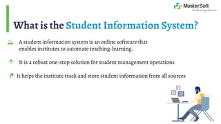 A Student Information System (SIS) is an online software solution designed to automate student management operations in educational institutes. It facilitates centralized data storage, communication, and AI-based data analysis, benefiting faculty with reduced workloads and students through improved access to resources. Key features include high data security, customizable reports, and e-learning capabilities, enhancing overall educational efficiency and student success rates.