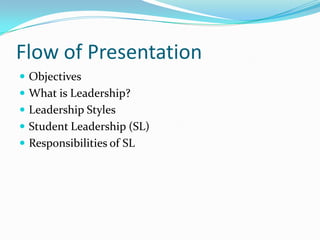 The document outlines the objectives and content of a presentation on leadership. It defines leadership as "a process of influencing an organized group toward accomplishing its goals." It discusses different leadership styles and defines student leadership as preparing students to become productive citizens and giving students a voice in school affairs. Finally, it lists the responsibilities of student leaders, such as maintaining discipline in the classroom, assembly, and school and looking after the school's assets, cleanliness, and general attendance.