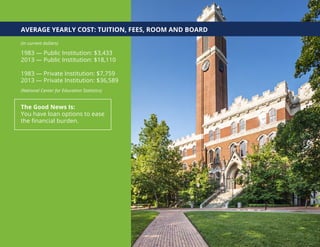 The document discusses the rising costs of higher education and the various student loan options available to help finance a degree. It outlines 6 major types of loans: Direct Subsidized and Unsubsidized Loans from the federal government, Perkins Loans, PLUS Loans for parents and graduate students, state-specific loans, and private student loans. The loans differ in their eligibility requirements, interest rates, and borrowing limits. The document stresses starting the financial planning and aid application process as early as possible to secure the necessary funding.