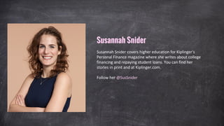 This document discusses strategies for dealing with student loan debt through a series of tweets from experts in the field. It includes tips from Susannah Snider on signing up for automatic payments to receive an interest rate reduction, from Betsy Mayotte on paying half the payment every two weeks to pay off loans faster, and from Brandon Endsley on not being afraid to ask questions about loans. Other tips include researching all loan options before committing, understanding the loan details, and finding ways to make more money or waste less.