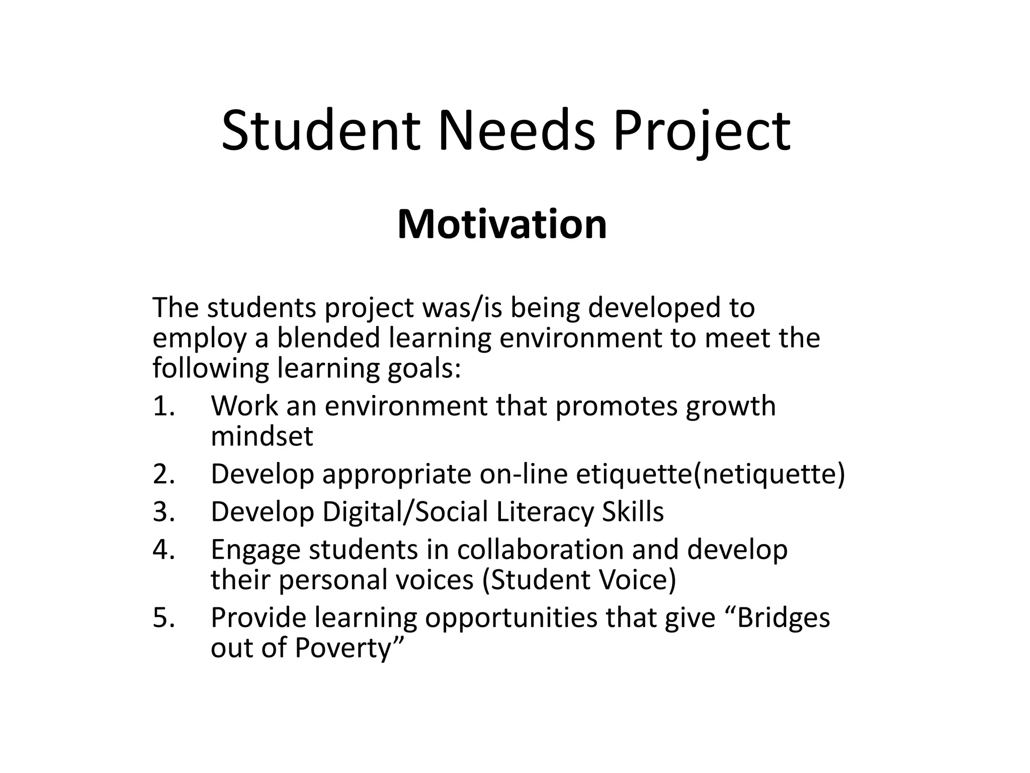 The Student Needs Project aims to employ a blended learning environment to meet several learning goals: developing a growth mindset, digital literacy skills, collaboration abilities, and opportunities to give "Bridges out of Poverty." It plans to build a website cataloguing community-created "how-to" lessons not taught in school but important for future success. The project framework uses the Simcoe County D2L environment and various web 2.0 tools to enhance learning and develop digital proficiency, employing a business startup model to create a complex website and brand.