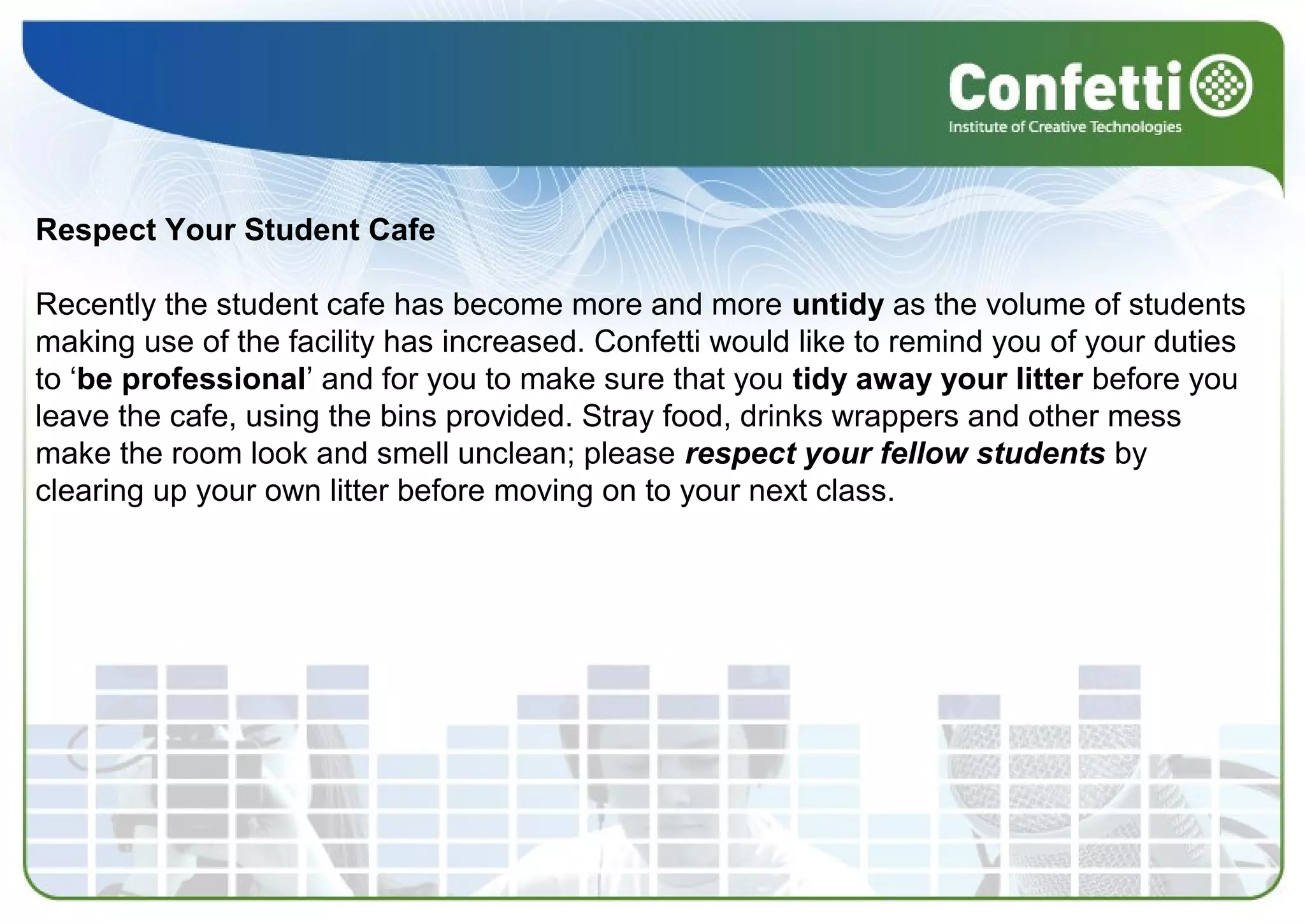 The weekly student notices remind students to clean up after themselves in the student cafe and inform them that EMA payments will be delayed up to 4 weeks due to paperwork issues. Students are also notified that the new library is open and about opportunities to purchase NUS cards and select student representatives.