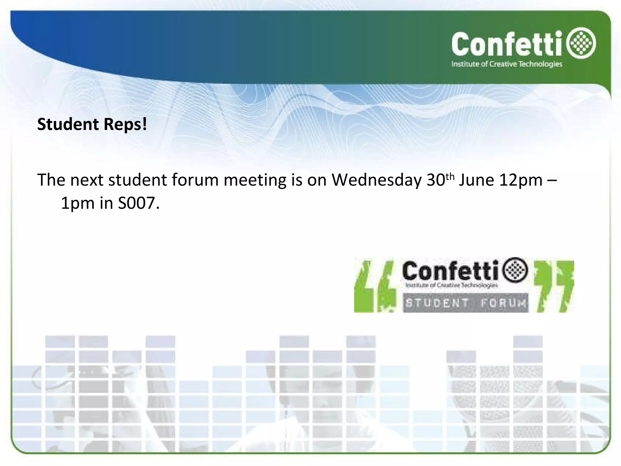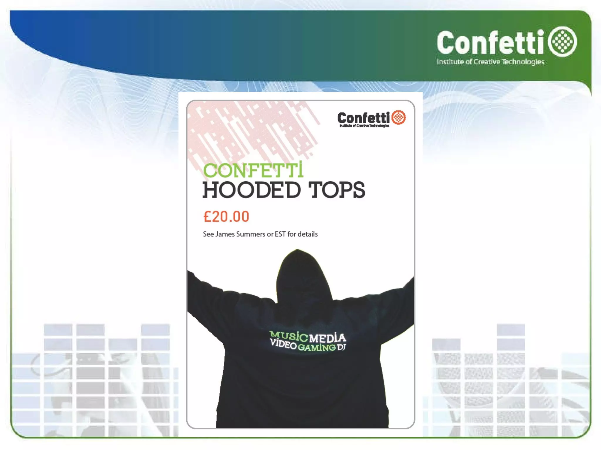 - A reminder to keep the Confetti studio clean and to book studio time 48 hours in advance.