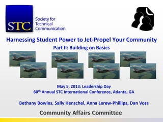 This document outlines four approaches for harnessing student power to strengthen Society for Technical Communication (STC) communities: 1) Face-to-face mentoring programs pairing STC professionals with students, 2) Virtual mentoring programs using an online platform, 3) Partnering with an English honors society to recruit student members, and 4) Distributing a comprehensive toolkit on establishing mentoring programs. Presentations and materials are provided to help chapters and special interest groups implement the approaches. The goal is to energize STC through engaging students.