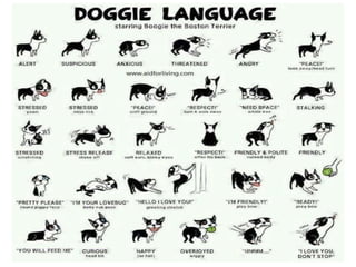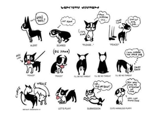 The document discusses various canine behaviors that indicate aggression or submission, including body posture, vocalizations, and facial expressions. It highlights specific signs such as growling, ear positioning, and tail angle, which can signify different states of a dog's temperament. Additionally, it suggests observing a related video for further insights into dog interactions.