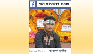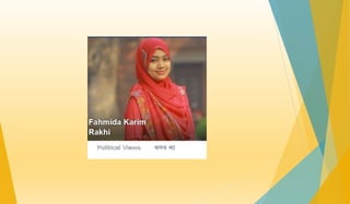 This presentation summarizes the history and current state of student politics in Bangladesh. It discusses major events in the glorious history of student politics such as the 1952 Bengali language movement and Bangladesh's liberation war in 1971. The presentation then outlines the current fragmented state of student politics, noting issues of campus violence and the politicization of universities. It concludes by proposing roles for both the government and students to improve the condition of student politics in Bangladesh.