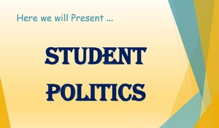This presentation discusses student politics, highlighting its history in Bangladesh and its implications on global student movements. It covers key historical events, notable political icons, and the current state of student political involvement, along with suggested roles for both students and government to improve conditions. The document concludes with an invitation for questions and further discussion.